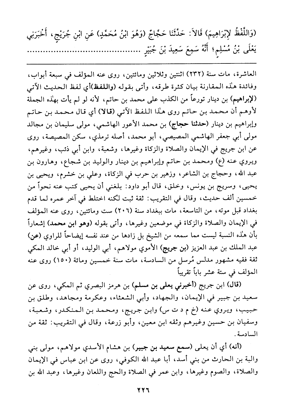 العاشرة، مات سنة (٢٣٢) اثنتين وثلاثين ومائتين، روى عنه المؤلف في سبعة أبواب، وفائدة هذه المقارنة بيان كثرة طرقه، وأتى بقوله (واللفظ) أي لفظ الحديث الآتي (لإبراهيم) بن دينار تورعًا من الكذب على محمد بن حاتم، لأنه لو لم يأت بهذه الجملة لأوهم أن محمد بن حاتم روى هذا اللفظ الآتي (قالا) أي قال محمد بن حاتم وإبراهيم بن دينار (حدثنا حجاج) بن محمد الأعور الهاشمي، مولى سليمان بن مجالد مولى أبي جعفر الهاشمي المصيصي، أبو محمد، أصله ترمذي، سكن المصيصة، روى عن ابن جريج في الإيمان والصلاة والزكاة وغيرها، وشعبة، وابن أبي ذئب، وغيرهم، ويروي عنه (ع) ومحمد بن حاتم وإبراهيم بن دينار والوليد بن شجاع، وهارون بن عبد الله، وحجاج بن الشاعر، وزهير بن حرب في الزكاة، وعلي بن خشرم، ويحيى بن يحيى، وسريج بن يونس، وخلق، قال أبو داود: بلغني أن يحيى كتب عنه نحوًا من خمسين ألف حديث، وقال في التقريب: ثقة ثبت لكنه اختلط في آخر عمره لما قدم بغداد قبل موته، من التاسعة، مات ببغداد سنة (٢٠٦) ست ومائتين، روى عنه المؤلف في الإيمان والصلاة والزكاة في موضعين وغيرها، وأتى بقوله (وهو ابن محمد) إشعارًا بأن هذه النسبة ليست مما سمعه من الشيخ بل زادها من عند نفسه إيضاحًا للراوي (عن) عبد الملك بن عبد العزيز (بن جريج) الأموي مولاهم، أبي الوليد، أو أبي خالد المكي ثقة فقيه مشهور مدلس مُرسل من السادسة، مات سنة خمسين ومائة (١٥٠) روى عنه المؤلف في ستة عشر بابًا تقريبًا.