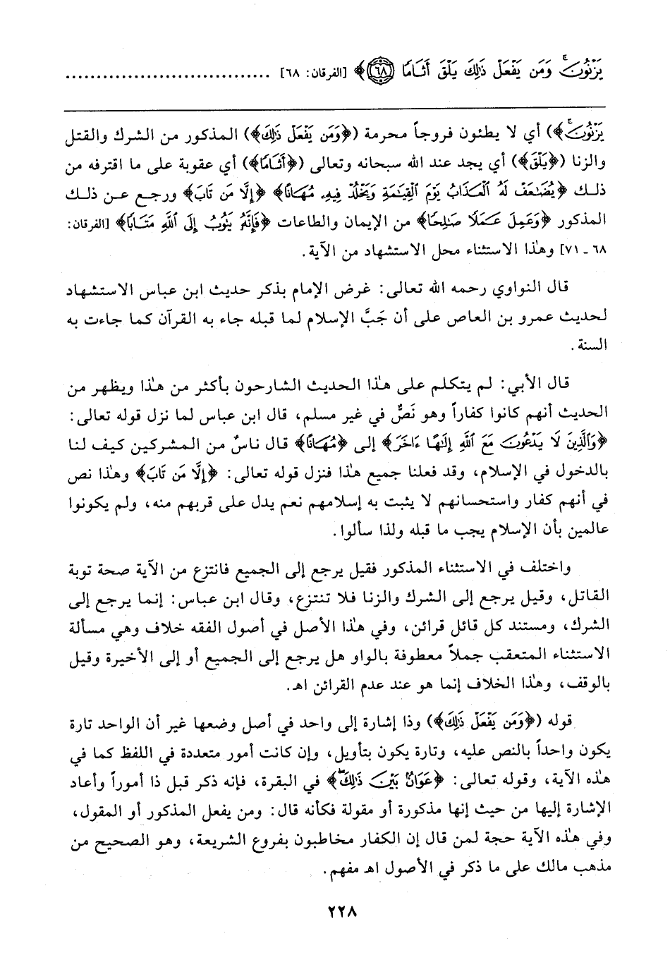 يَزْنُونَ}) أي لا يطئون فروجًا محرمة ({وَمَنْ يَفْعَلْ ذَلِكَ}) المذكور من الشرك والقتل والزنا ({يَلْقَ}) أي يجد عند الله سبحانه وتعالى ({أَثَامًا}) أي عقوبة على ما اقترفه من ذلك {يُضَاعَفْ لَهُ الْعَذَابُ يَوْمَ الْقِيَامَةِ وَيَخْلُدْ فِيهِ مُهَانًا} {إلا مَنْ تَابَ} ورجع عن ذلك المذكور {وَعَمِلَ عَمَلًا صَالِحًا} من الإيمان والطاعات {فَإِنَّهُ يَتُوبُ إِلَى اللَّهِ مَتَابًا} [الفرقان: ٦٨ - ٧١] وهذا الاستثناء محل الاستشهاد من الآية.