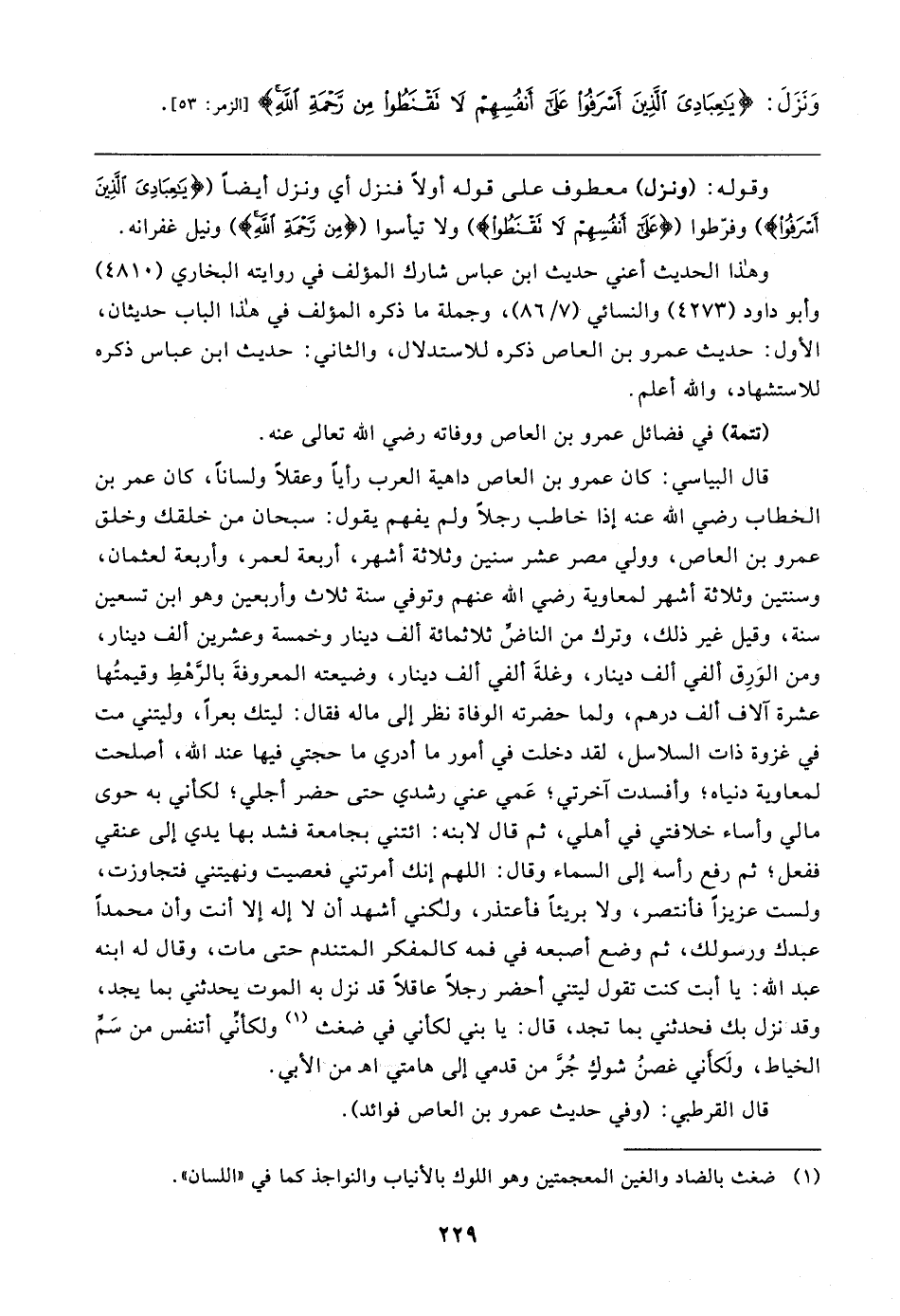 قال البياسي: كان عمرو بن العاص داهية العرب رأيًا وعقلًا ولسانًا، كان عمر بن الخطاب رضي الله عنه إذا خاطب رجلًا ولم يفهم يقول: سبحان من خلقك وخلق عمرو بن العاص، وولي مصر عشر سنين وثلاثة أشهر، أربعة لعمر، وأربعة لعثمان، وسنتين وثلاثة أشهر لمعاوية رضي الله عنهم وتوفي سنة ثلاث وأربعين وهو ابن تسعين سنة، وقيل غير ذلك، وترك من الناضِّ ثلاثمائة ألف دينار وخمسة وعشرين ألف دينار، ومن الوَرِق ألفي ألف دينار، وغلةَ ألفي ألف دينار، وضيعته المعروفةَ بالرَّهْطِ وقيمتها عشرة آلاف ألف درهم، ولما حضرته الوفاة نظر إلى ماله فقال: ليتك بعرًا، وليتني مت في غزوة ذات السلاسل، لقد دخلت في أمور ما أدري ما حجتي فيها عند الله، أصلحت لمعاوية دنياه؛ وأفسدت آخرتي؛ عَمي عني رشدي حتى حضر أجلي؛ لكأني به حوى مالي وأساء خلافتي في أهلي، ثم قال لابنه: ائتني بجامعة فشد بها يدي إلى عنقي ففعل؛ ثم رفع رأسه إلى السماء وقال: اللهم إنك أمرتني فعصيت ونهيتني فتجاوزت، ولست عزيزًا فانتصر، ولا بريئًا فأعتذر، ولكني أشهد أن لا إله إلا أنت وأن محمدًا عبدك ورسولك، ثم وضع أصبعه في فمه كالمفكر المتندم حتى مات، وقال له ابنه عبد الله: يا أبت كنت تقول ليتني أحضر رجلًا عاقلًا قد نزل به الموت يحدثني بما يجد، وقد نزل بك فحدثني بما تجد، قال: يا بني لكاني في ضغث (١) ولكأنِّي أتنفس من سَمِّ الخياط، ولَكأَني غصنُ شوكٍ جُرَّ من قدمي إلى هامتي اهـ من الأبي.