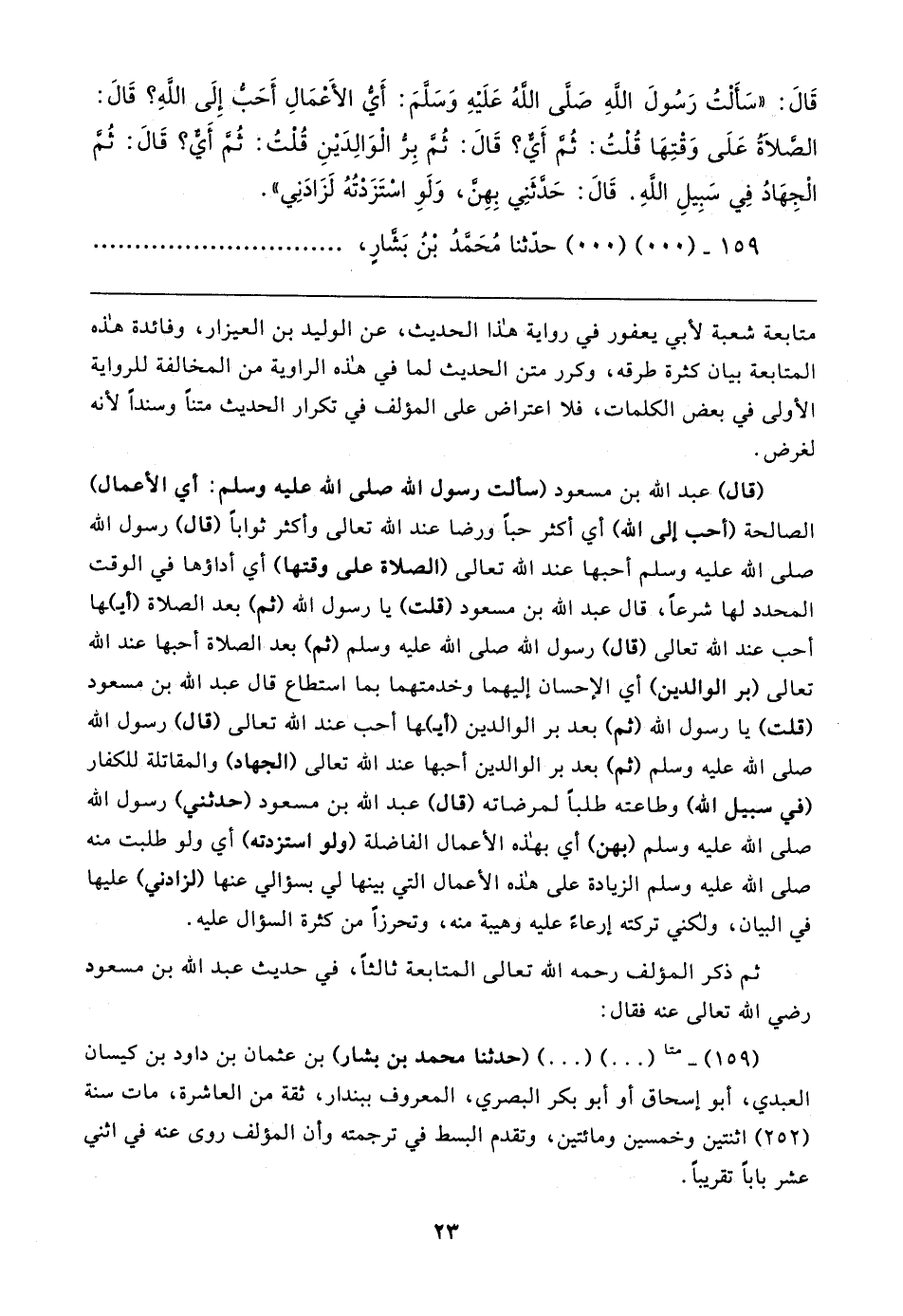 قَال: "سَأَلْتُ رَسُولَ اللهِ صَلى الله عَلَيهِ وسلَّمَ: أَيُّ الأَعْمَالِ أَحَبُّ إِلَى الله؟ قَال: الصَّلَاةُ عَلَى وَقْتِهَا قُلْتُ: ثُمَّ أَيٌّ؟ قَال: ثُمّ بِرُّ الْوَالِدَينِ قُلْتُ: ثُمّ أَيٌّ؟ قَال: ثُمَّ الْجِهَادُ في سَبِيلِ الله. قَال: حَدثني بِهِنَّ، وَلَو اسْتَزَدْتُهُ لَزَادَنِي".