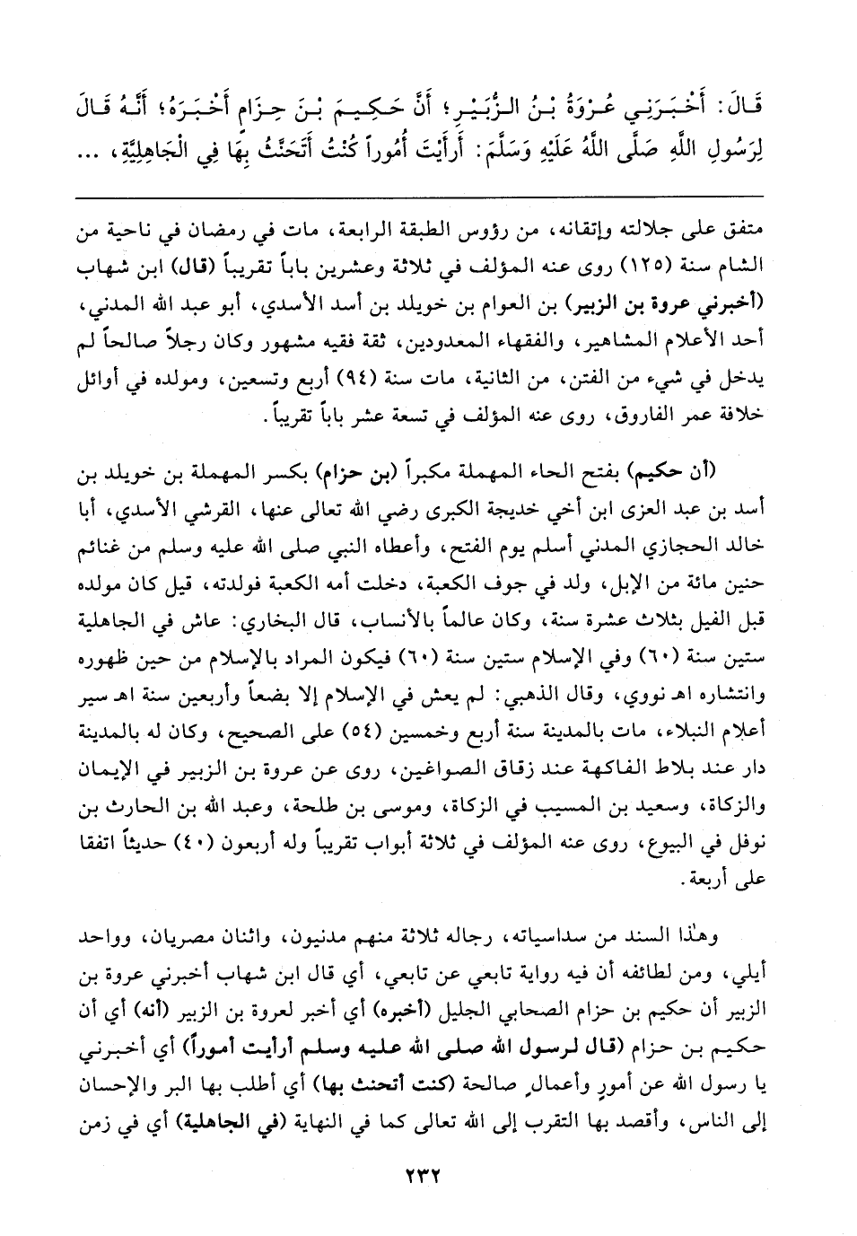 قَال: أَخْبَرَنِي عُرْوَةُ بْنُ الزُّبَيْرِ؛ أَنَّ حَكِيمَ بْنَ حِزَامٍ أَخْبَرَهُ؛ أَنَّهُ قَال لِرَسُولِ اللهِ صَلَّى اللهُ عَلَيهِ وَسَلَّمَ: أَرأَيتَ أُمُورًا كُنْتُ أَتَحَنَّثُ بِهَا فِي الْجَاهِلِيَّةِ،