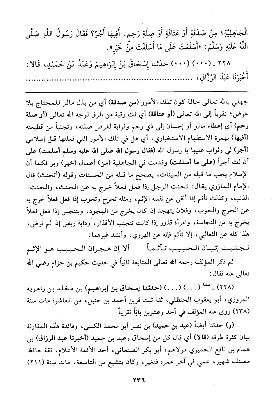 ٢٢٨ - (٠٠) (٠٠) حدَّثنا إِسْحَاقُ بْنُ إِبْرَاهِيمَ وَعَبْدُ بْنُ حُمَيدٍ، قَالا: أَخْبَرَنَا عَبْدُ الرَّزَّاقِ،
