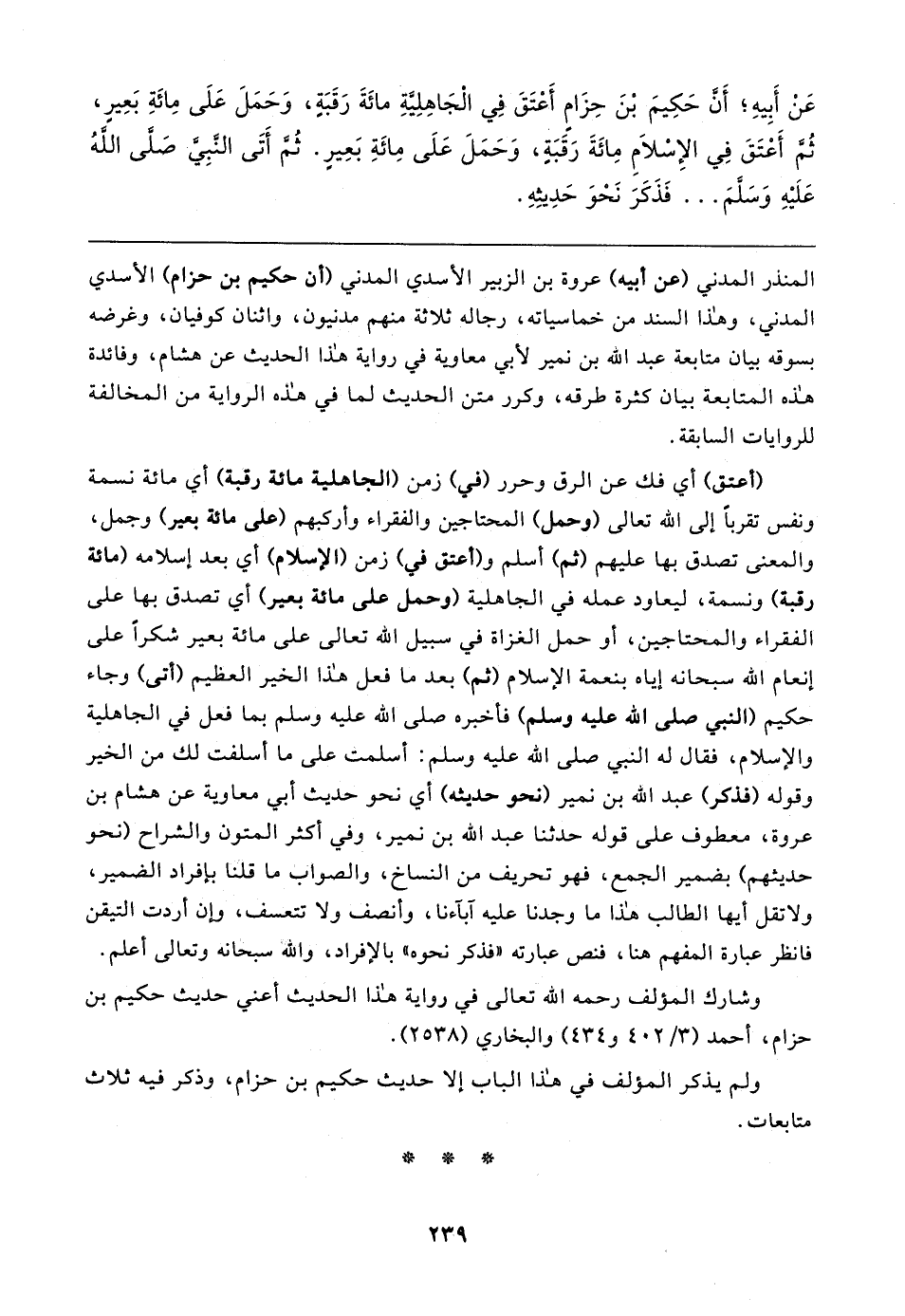 المنذر المدني (عن أبيه) عروة بن الزبير الأسدي المدني (أن حكيم بن حزام) الأسدي المدني، وهذا السند من خماسياته، رجاله ثلاثة منهم مدنيون، واثنان كوفيان، وغرضه بسوقه بيان متابعة عبد الله بن نمير لأبي معاوية في رواية هذا الحديث عن هشام، وفائدة هذه المتابعة بيان كثرة طرقه، وكرر متن الحديث لما في هذه الرواية من المخالفة للروايات السابقة.