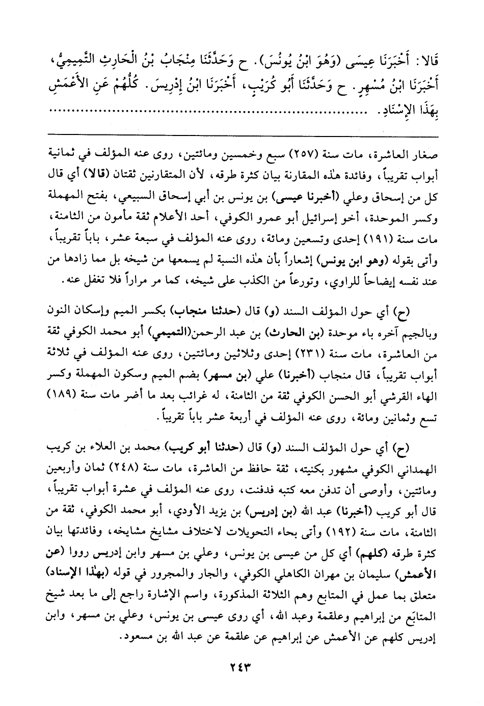 (ح) أي حول المؤلف السند (و) قال (حدثنا أبو كريب) محمد بن العلاء بن كريب الهمداني الكوفي مشهور بكنيته، ثقةٌ حافظ من العاشرة، مات سنة (٢٤٨) ثمان وأربعين ومائتين، وأوصى أن تدفن معه كتبه فدفنت، روى عنه المؤلف في عشرة أبواب تقريبًا، قال أبو كريب (أخبرنا) عبد الله (بن إدريس) بن يزيد الأودي، أبو محمد الكوفي، ثقة من الثامنة، مات سنة (١٩٢) وأتى بحاء التحويلات لاختلاف مشايخ مشايخه، وفائدتها بيان كثرة طرقه (كلهم) أي كل من عيسى بن يونس، وعلي بن مسهر وابن إدريس رووا (عن الأعمش) سليمان بن مهران الكاهلي الكوفي، والجار والمجرور في قوله (بهذا الإسناد) متعلق بما عمل في المتابع وهم الثلاثة المذكورة، واسم الإشارة راجع إلى ما بعد شيخ المتابَع من إبراهيم وعلقمة وعبد الله، أي روى عيسى بن يونس، وعلي بن مسهر، وابن إدريس كلهم عن الأعمش عن إبراهيم عن علقمة عن عبد الله بن مسعود.