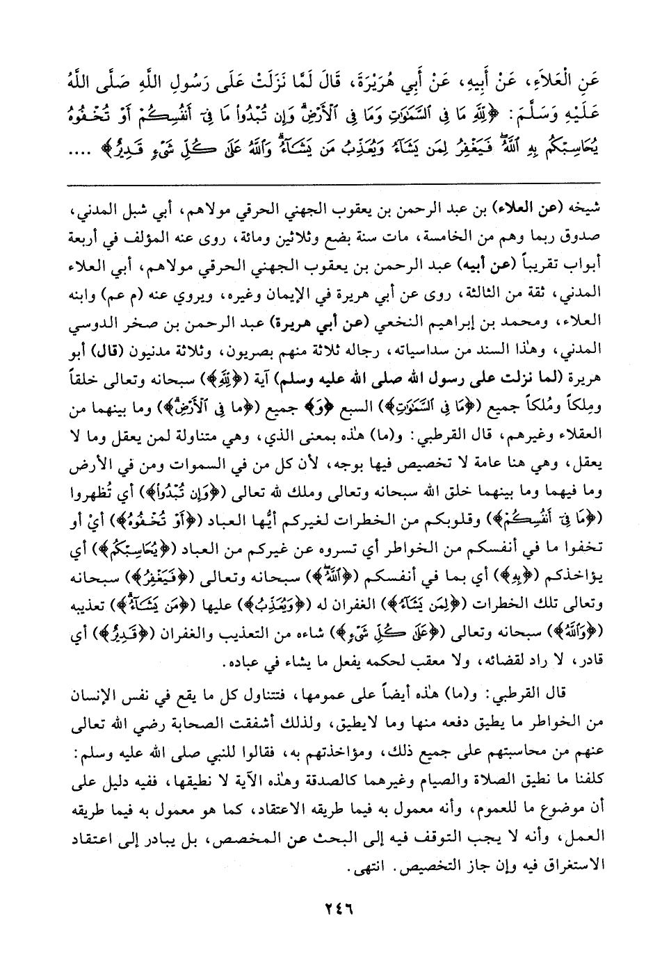 عَنِ الْعَلاءِ، عَنْ أبِيهِ، عَنْ أَبِي هُرَيرَةَ، قَال لَمَّا نَزَلَتْ عَلَى رَسُولِ اللهِ صَلَّى اللهُ عَلَيهِ وَسَلَّمَ: {لِلَّهِ مَا فِي السَّمَاوَاتِ وَمَا فِي الْأَرْضِ وَإِنْ تُبْدُوا مَا فِي أَنْفُسِكُمْ أَوْ تُخْفُوهُ يُحَاسِبْكُمْ بِهِ اللَّهُ فَيَغْفِرُ لِمَنْ يَشَاءُ وَيُعَذِّبُ مَنْ يَشَاءُ وَاللَّهُ عَلَى كُلِّ شَيءٍ قَدِيرٌ}