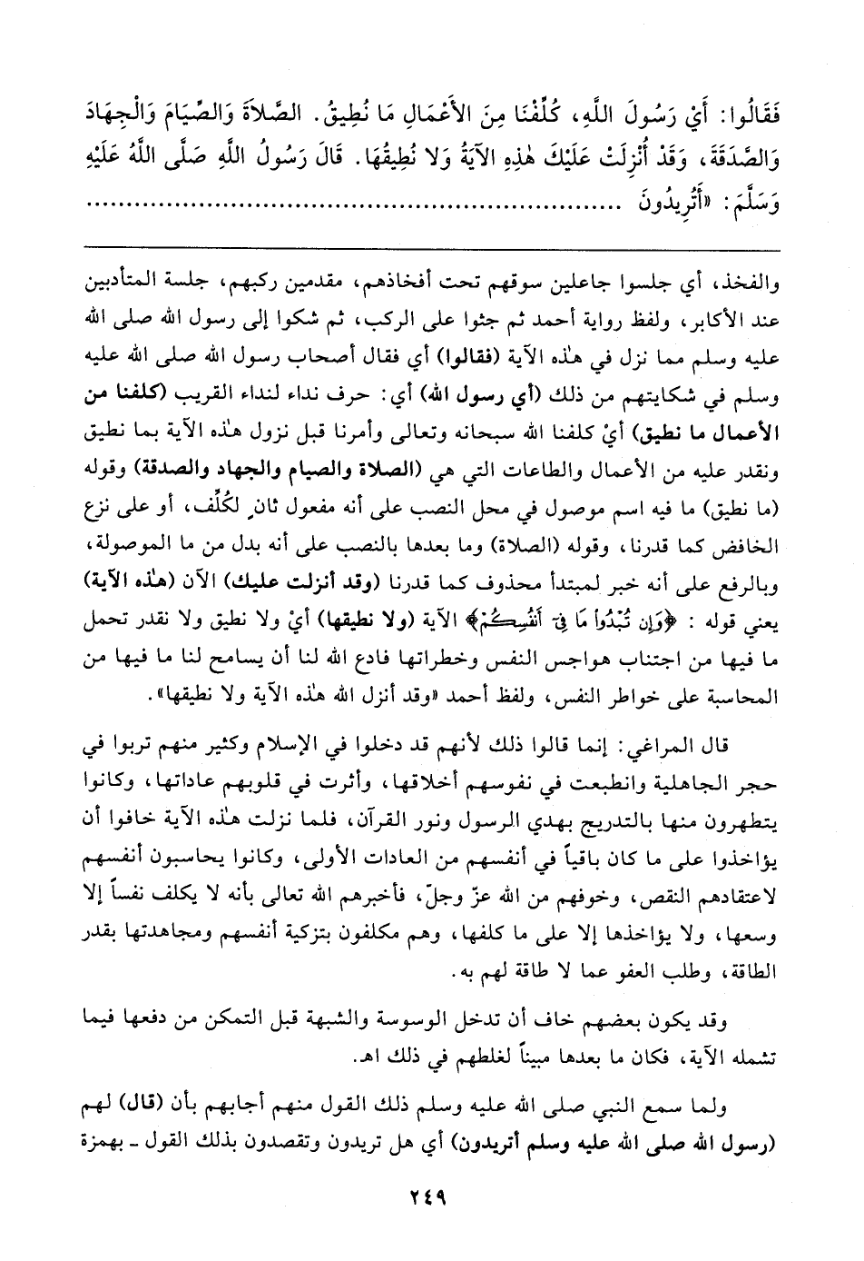 فَقَالُوا: أَي رَسُولَ اللهِ، كُلِّفْنَا مِنَ الأَعْمَالِ مَا نُطِيقُ. الصَّلاةَ وَالصِّيَامَ وَالْجِهَادَ وَالصَّدَقَةَ، وَقَدْ أُنْزِلَتْ عَلَيكَ هذِهِ الآيَةُ وَلا نُطِيقُهَا. قَال رَسُولُ اللهِ صَلَّى اللهُ عَلَيهِ وَسَلَّمَ: "أَتُرِيدُونَ