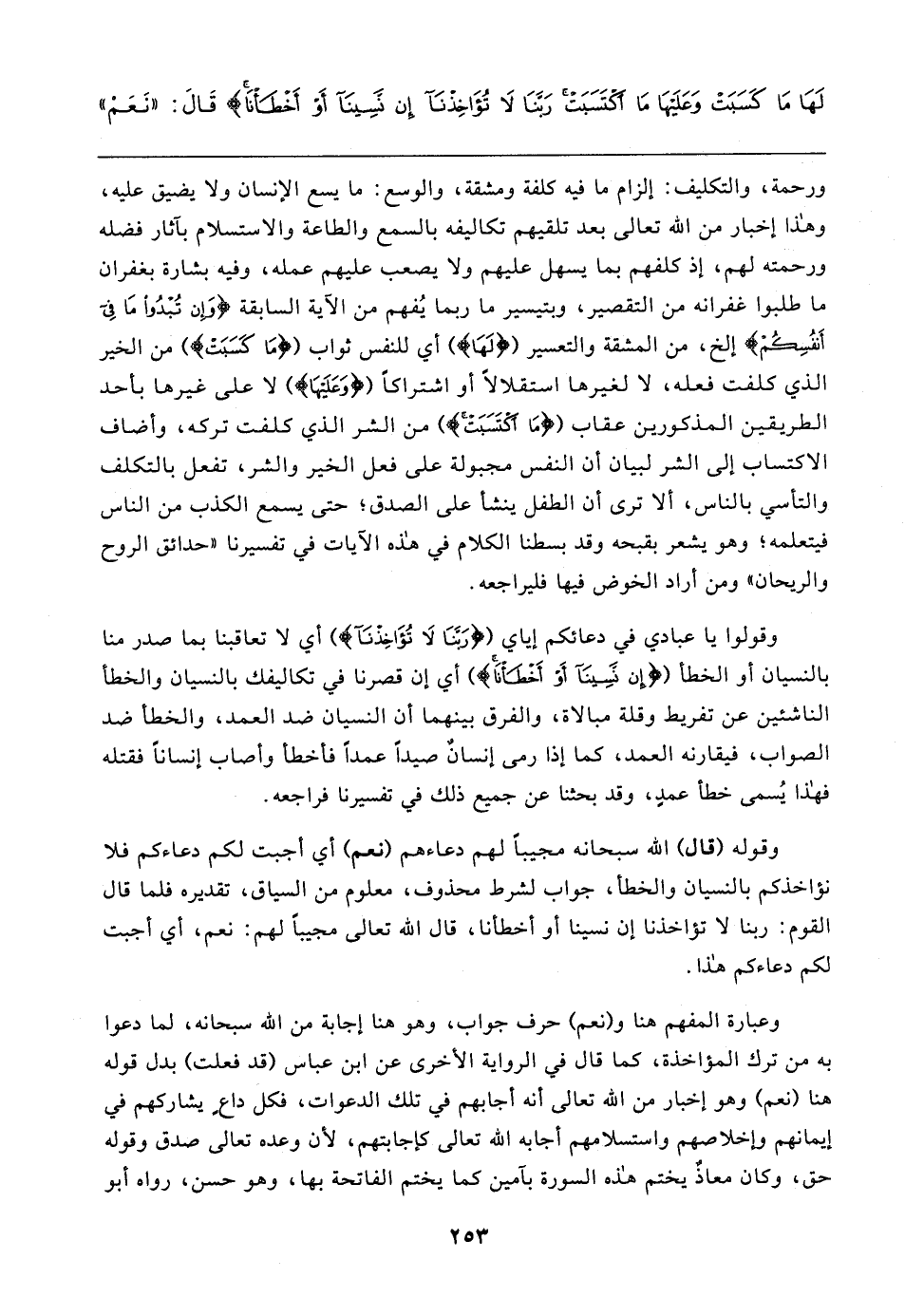 ورحمة، والتكليف: إلزام ما فيه كلفة ومشقة، والوسع: ما يسع الإنسان ولا يضيق عليه، وهذا إخبار من الله تعالى بعد تلقيهم تكاليفه بالسمع والطاعة والاستسلام بآثار فضله ورحمته لهم، إذ كلفهم بما يسهل عليهم ولا يصعب عليهم عمله، وفيه بشارة بغفران ما طلبوا غفرانه من التقصير، وبتيسير ما ربما يُفهم من الآية السابقة {وَإِنْ تُبْدُوا مَا فِي أَنْفُسِكُمْ} إلخ، من المشقة والتعسير ({لَهَا}) أي للنفس ثواب ({مَا كَسَبَتْ}) من الخير الذي كلفت فعله، لا لغيرها استقلالًا أو اشتراكًا ({وَعَلَيهَا}) لا على غيرها بأحد الطريقين المذكورين عقاب ({مَا اكْتَسَبَتْ}) من الشر الذي كلفت تركه، وأضاف الاكتساب إلى الشر لبيان أن النفس مجبولة على فعل الخير والشر، تفعل بالتكلف والتأسي بالناس، ألا ترى أن الطفل ينشأ على الصدق؛ حتى يسمع الكذب من الناس فيتعلمه؛ وهو يشعر بقبحه وقد بسطنا الكلام في هذه الآيات في تفسيرنا "حدائق الروح والريحان" ومن أراد الخوض فيها فليراجعه.