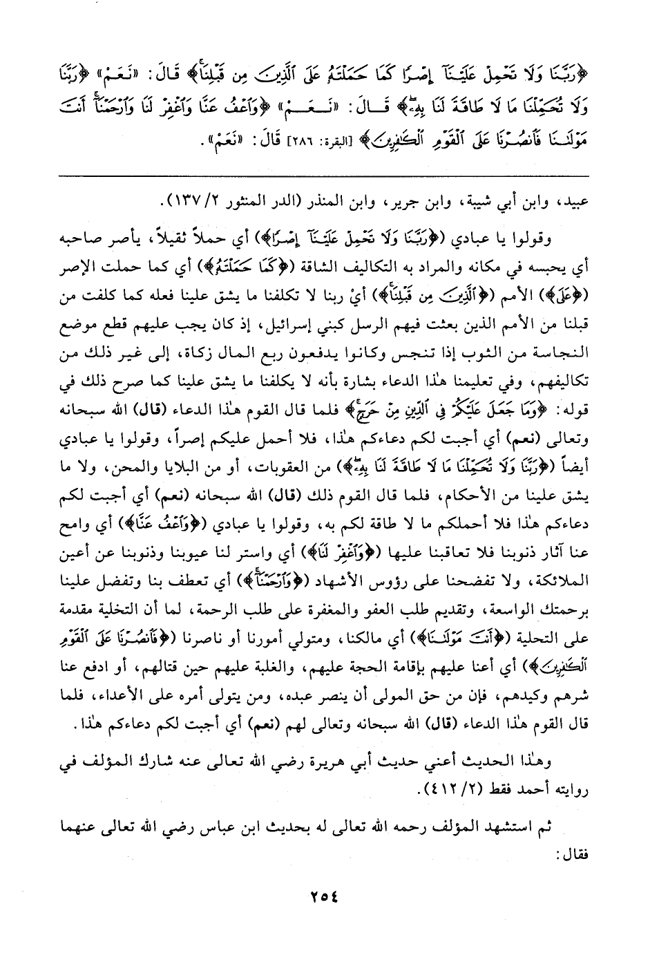 وقولوا يا عبادي ({رَبَّنَا وَلَا تَحْمِلْ عَلَينَا إِصْرًا}) أي حملًا ثقيلًا، يأصر صاحبه أي يحبسه في مكانه والمراد به التكاليف الشاقة ({كَمَا حَمَلْتَهُ}) أي كما حملت الإصر ({عَلَى}) الأمم ({الَّذِينَ مِنْ قَبْلِنَا}) أي ربنا لا تكلفنا ما يشق علينا فعله كما كلفت من قبلنا من الأمم الذين بعثت فيهم الرسل كبني إسرائيل، إذ كان يجب عليهم قطع موضع النجاسة من الثوب إذا تنجس وكانوا يدفعون ربع المال زكاة، إلى غير ذلك من تكاليفهم، وفي تعليمنا هذا الدعاء بشارة بأنه لا يكلفنا ما يشق علينا كما صرح ذلك في قوله: {وَمَا جَعَلَ عَلَيكُمْ فِي الدِّينِ مِنْ حَرَجٍ} [الحج: ٧٨] فلما قال القوم هذا الدعاء (قال) الله سبحانه وتعالى (نعم) أي أجبت لكم دعاءكم هذا، فلا أحمل عليكم إصرًا، وقولوا يا عبادي أيضًا ({رَبَّنَا وَلَا تُحَمِّلْنَا مَا لَا طَاقَةَ لَنَا بِهِ}) من العقوبات، أو من البلايا والمحن، ولا ما يشق علينا من الأحكام، فلما قال القوم ذلك (قال) الله سبحانه (نعم) أي أجبت لكم دعاءكم هذا فلا أحملكم ما لا طاقة لكم به، وقولوا يا عبادي ({وَاعْفُ عَنَّا}) أي وامح عنا آثار ذنوبنا فلا تعاقبنا عليها ({وَاغْفِرْ لَنَا}) أي واستر لنا عيوبنا وذنوبنا عن أعين الملائكة، ولا تفضحنا على رؤوس الأشهاد ({وَارْحَمْنَا}) أي تعطف بنا وتفضل علينا برحمتك الواسعة، وتقديم طلب العفو والمغفرة على طلب الرحمة، لما أن التخلية مقدمة على التحلية ({أَنْتَ مَوْلَانَا}) أي مالكنا، ومتولي أمورنا أو ناصرنا ({فَانْصُرْنَا عَلَى الْقَوْمِ الْكَافِرِينَ}) أي أعنا عليهم بإقامة الحجة عليهم، والغلبة عليهم حين قتالهم، أو ادفع عنا شرهم وكيدهم، فإن من حق المولى أن ينصر عبده، ومن يتولى أمره على الأعداء، فلما قال القوم هذا الدعاء (قال) الله سبحانه وتعالى لهم (نعم) أي أجبت لكم دعاءكم هذا.