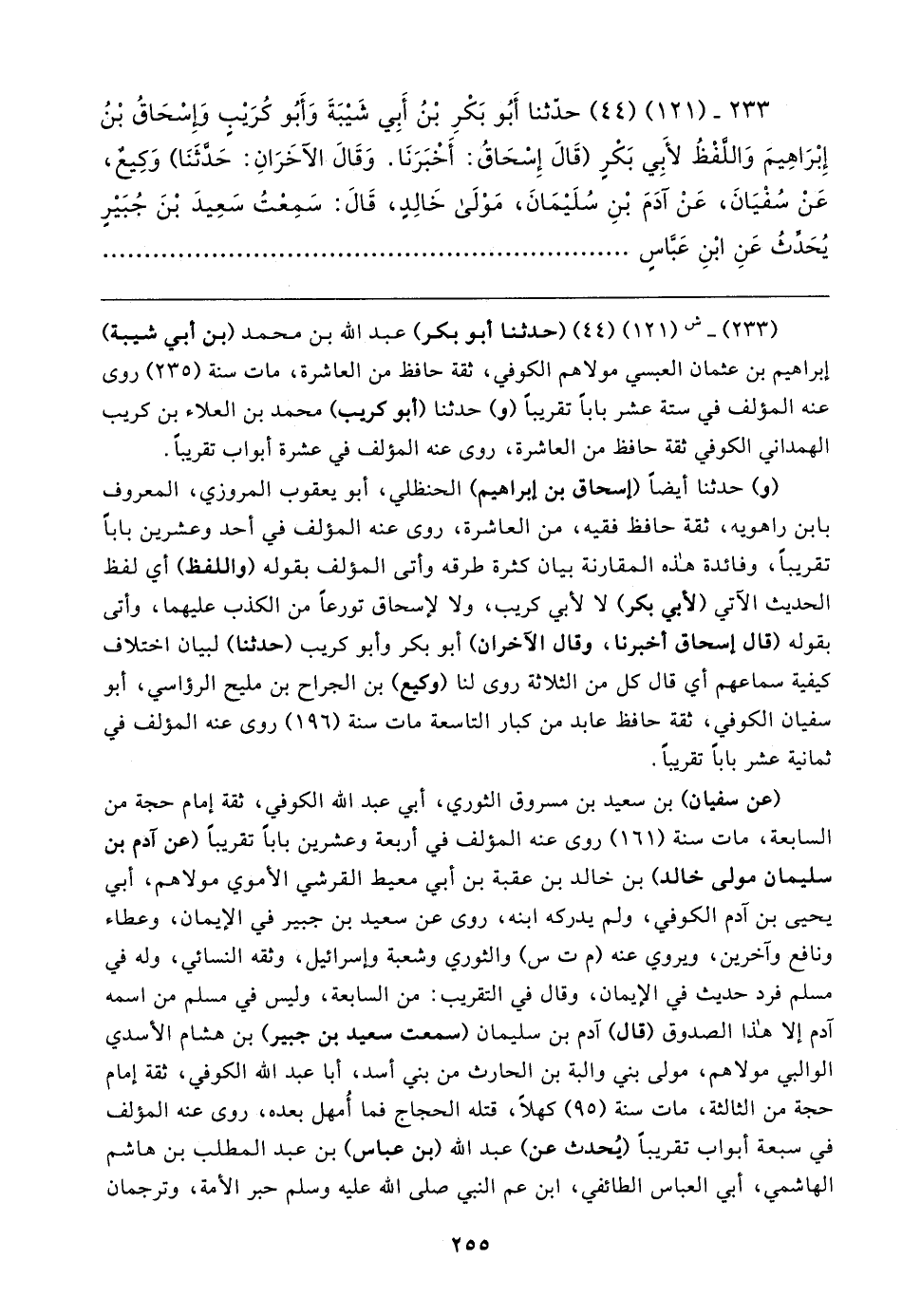 (٢٣٣) - ش (١٢١) (٤٤) (حدثنا أبو بكر) عبد الله بن محمَّد (بن أبي شيبة) إبراهيم بن عثمان العبسي مولاهم الكوفي، ثقة حافظ من العاشرة، مات سنة (٢٣٥) روى عنه المؤلف في ستة عشر بابًا تقريبًا (و) حدثنا (أبو كريب) محمَّد بن العلاء بن كريب الهمداني الكوفي ثقة حافظ من العاشرة، روى عنه المؤلف في عشرة أبواب تقريبًا.