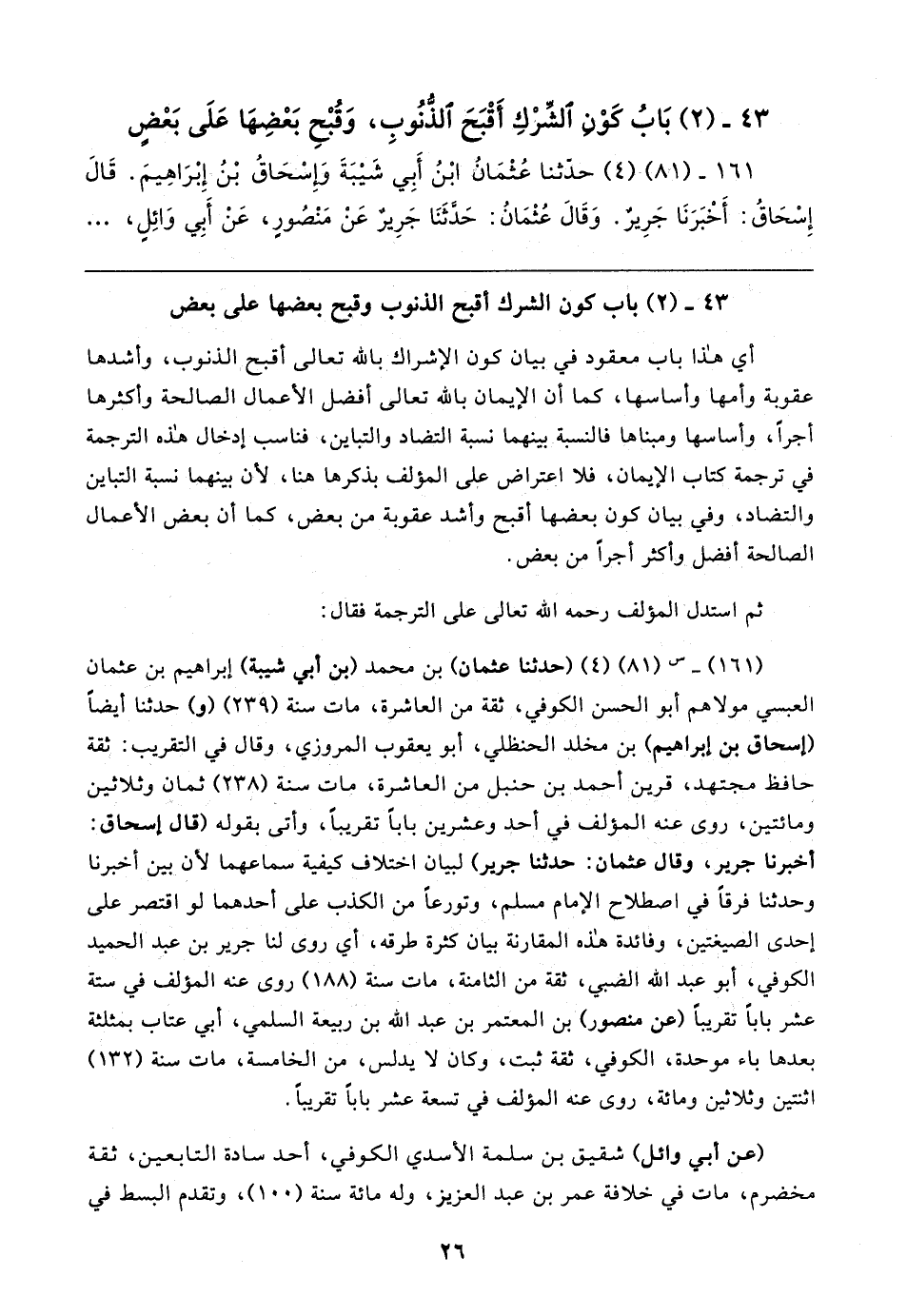 ١٦١ - (٨١) (٤) حَدَّثَنَا عُثْمَانُ ابْنُ أَبِي شَيبَةَ وَإسْحَاقُ بْنُ إِبْرَاهِيمَ. قَال إِسْحَاقُ: أَخْبَرَنَا جَرِيرٌ. وَقَال عُثْمَانُ: حَدَّثَنَا جَرِيرٌ عَنْ مَنْصُورِ، عَنْ أبي وَائِلٍ،