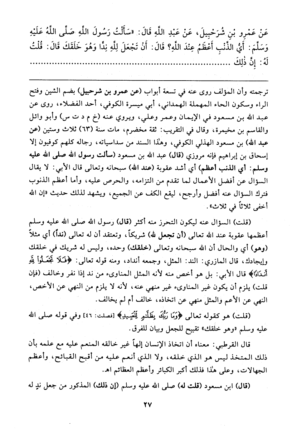 عَنْ عَمْرِو بْنِ شُرَحْبِيلَ، عَنْ عَبدِ اللهِ قَال: "سَأَلْتُ رَسُولَ اللهِ صلَّى الله عَلَيهِ وَسلَّمَ: أَيُّ الذَّنْبِ أَعْظَمُ عِنْدَ اللهِ؟ قَال: أَنْ تَجْعَلَ لله نِدًّا وَهُوَ خَلَقَكَ قَال: قُلْتُ لَهُ: إِنَّ ذلِكَ