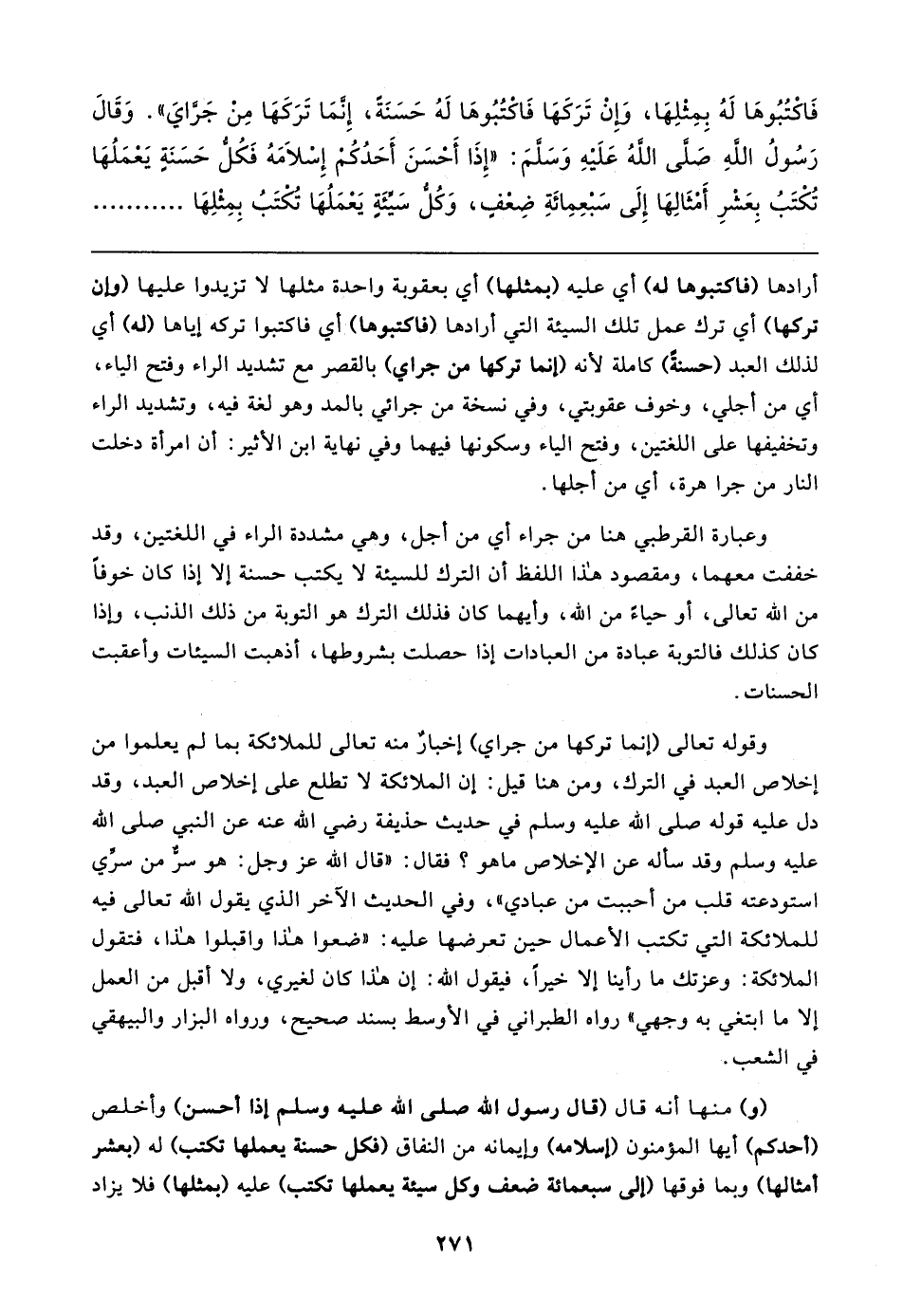 فَاكْتُبُوهَا لَهُ بِمِثْلِهَا، وَإِنْ تَرَكَهَا فَاكْتُبُوهَا لَهُ حَسَنَةً، إِنَّمَا تَرَكَهَا مِنْ جَرَّايَ". وَقَال رَسُولُ اللهِ - صَلَّى اللهُ عَلَيهِ وَسَلَّمَ -: "إِذَا أَحْسَنَ أَحَدُكُمْ إِسْلامَهُ فَكُلُّ حَسَنَةٍ يَعْمَلُهَا تُكْتَبُ بِعَشْرِ أَمْثَالِهَا إِلَى سَبْعِمِائَةِ ضِعْفٍ، وَكُلُّ سَيِّئَةٍ يَعْمَلُهَا تُكْتَبُ بِمِثْلِهَا