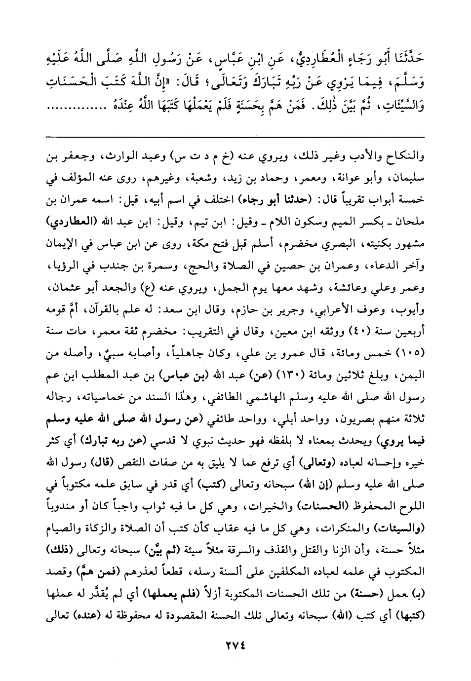 حَدَّثَنَا أَبُو رَجَاءٍ الْعُطَارِدِيُّ، عَنِ ابْنِ عَبَّاسٍ، عَنْ رَسُولِ اللهِ - صَلَّى اللهُ عَلَيهِ وَسَلَّمَ، فِيمَا يَرْوي عَنْ رَبِّهِ تَبَارَكَ وَتَعَالى؛ قَال: "إِنَّ اللهَ كَتَبَ الْحَسَنَاتِ وَالسَّيِّئَاتِ، ثُمَّ بَيَّنَ ذلِكَ. فَمَنْ هَمَّ بِحَسَنَةٍ فَلَمْ يَعْمَلْهَا كَتَبَهَا اللهُ عِنْدَهُ