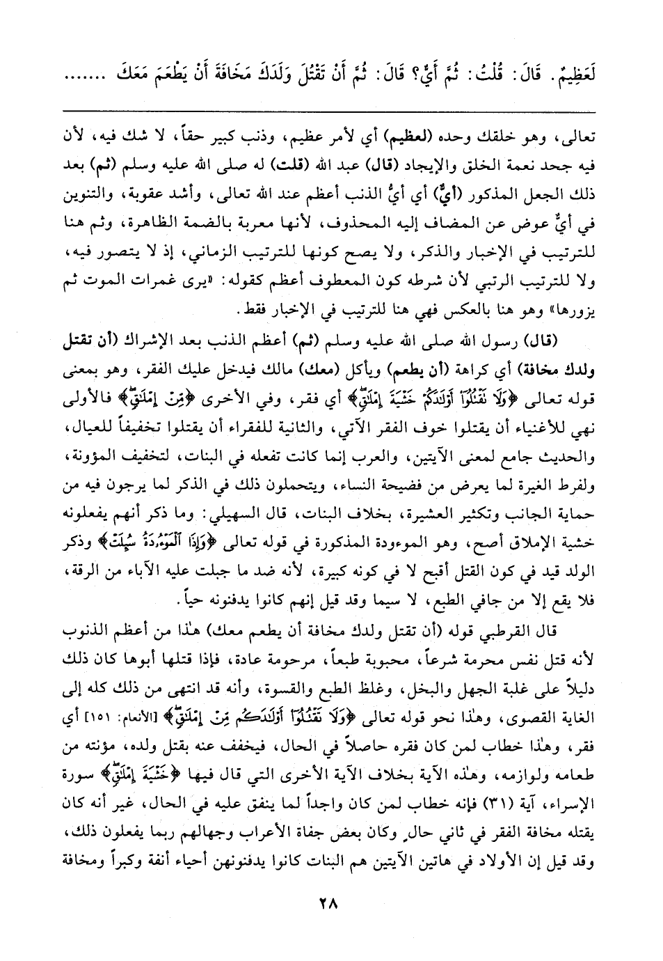 قال القرطبي قوله (أن تقتل ولدك مخافة أن يطعم معك) هذا من أعظم الذنوب لأنه قتل نفس محرمة شرعًا، محبوبة طبعًا، مرحومة عادة، فإذا قتلها أبوها كان ذلك دليلًا على غلبة الجهل والبخل، وغلظ الطبع والقسوة، وأنه قد انتهى من ذلك كله إلى الغاية القصوى، وهذا نحو قوله تعالى {وَلَا تَقْتُلُوا أَوْلَادَكُمْ مِنْ إِمْلَاقٍ} [الأنعام: ١٥١] أي فقر، وهذا خطاب لمن كان فقره حاصلًا في الحال، فيخفف عنه بقتل ولده، مؤنته من طعامه ولوازمه، وهذه الآية بخلاف الآية الأخرى التي قال فيها {خَشْيَةَ إِمْلَاقٍ} سورة الإسراء، آية (٣١) فإنَّه خطاب لمن كان واجدًا لما ينفق عليه في الحال، غير أنَّه كان يقتله مخافة الفقر في ثاني حالٍ وكان بعض جفاة الأعراب وجهالهم ربما يفعلون ذلك، وقد قيل إن الأولاد في هاتين الآيتين هم البنات كانوا يدفنونهن أحياء أنفة وكبرًا ومخافة
