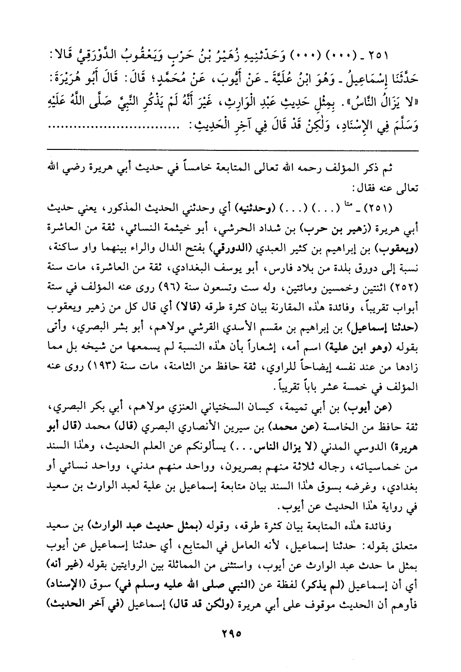 ٢٥١ - (. . .) (. . .) وَحَدّثنِيهِ زُهَيرُ بْنُ حَرْبٍ وَيَعْقُوبُ الدَّوْرَقِيُّ قَالا: حَدَّثَنَا إِسْمَاعِيلُ - وَهُوَ ابْنُ عُلَيَّةَ - عَنْ أَيُّوبَ، عَنْ مُحَمَّدٍ؛ قَال: قَال أَبُو هُرَيرَةَ: "لا يَزَالُ النَّاسُ". بِمِثْلِ حَدِيثِ عَبْدِ الْوَارِثِ، غَيرَ أَنَّهُ لَمْ يَذْكُرِ النَّبِيَّ - صَلَّى اللهُ عَلَيهِ وَسَلَّمَ - فِي الإِسْنَادِ، وَلكِنْ قَدْ قَال فِي آخِرِ الْحَدِيثِ: