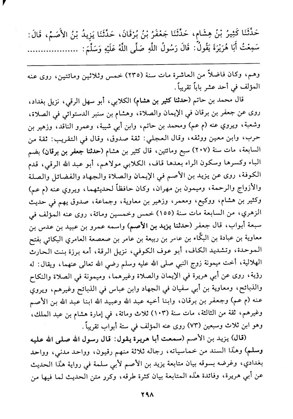 قال محمَّد بن حاتم (حدثنا كثير بن هشام) الكلابي، أبو سهل الرقي، نزيل بغداد، روى عن جعفر بن برقان في الإيمان والصلاة، وهشام بن سنبر الدستوائي في الصلاة، وشعبة، ويروي عنه (م عم) ومحمد بن حاتم، وابن أبي شيبة، وعمرو الناقد، وزهير بن حرب، وابن معين ووثقه، وقال العجلي: ثقة صدوق، وقال في التقريب: ثقة من السابعة، مات سنة (٢٠٧) سبع ومائتين، قال كثير بن هشام (حدثنا جعفر بن برقان) بضم الباء وكسرها وسكون الراء بعدها قاف، الكلابي مولاهم، أبو عبد الله الرقي، قدم الكوفة، روى عن يزيد بن الأصم في الإيمان والصلاة والجهاد والفضائل والصلة والأزواج والرحمة، وميمون بن مهران، وكان حافظًا لحديثهما، ويروي عنه (م عم) وكثير بن هشام، ووكيع، ومعمر، وزهير بن معاوية، وجماعة، صدوق يهم في حديث الزهري، من السابعة مات سنة (١٥٥) خمس وخمسين ومائة، روى عنه المؤلف في سبعة أبواب، قال جعفر (حدثنا يزيد بن الأصم) واسمه عمرو بن عبيد بن عدس بن معاوية بن عبادة بن البكَّاء بن عامر بن ربيعة بن عامر بن صعصعة العامري البكائي بفتح الموحدة، وتشديد الكاف، أبو عوف الكوفي، نزيل الرقة، أمه برزة بنت الحارث الهلالية، أخت ميمونة زوج النبي - صلى الله عليه وسلم - رضي الله تعالى عنهما، ويقال: له رؤية، روى عن أبي هريرة في الإيمان والصلاة وغيرهما، وميمونة في الصلاة والنكاح والذبائح، ومعاوية بن أبي سفيان في الجهاد وابن عباس في الذبائح وغيرهم، ويروي عنه (م عم) وجعفر بن برقان، وابنا أخيه عبد الله وعبيد الله ابنا عبد الله بن الأصم وغيرهم، ثقة من الثالثة، مات سنة (١٠٣) ثلاث ومائة، في إمارة هشام بن عبد الملك، وهو ابن ثلاث وسبعين (٧٣) روى عنه المؤلف في ستة أبواب تقريبًا.