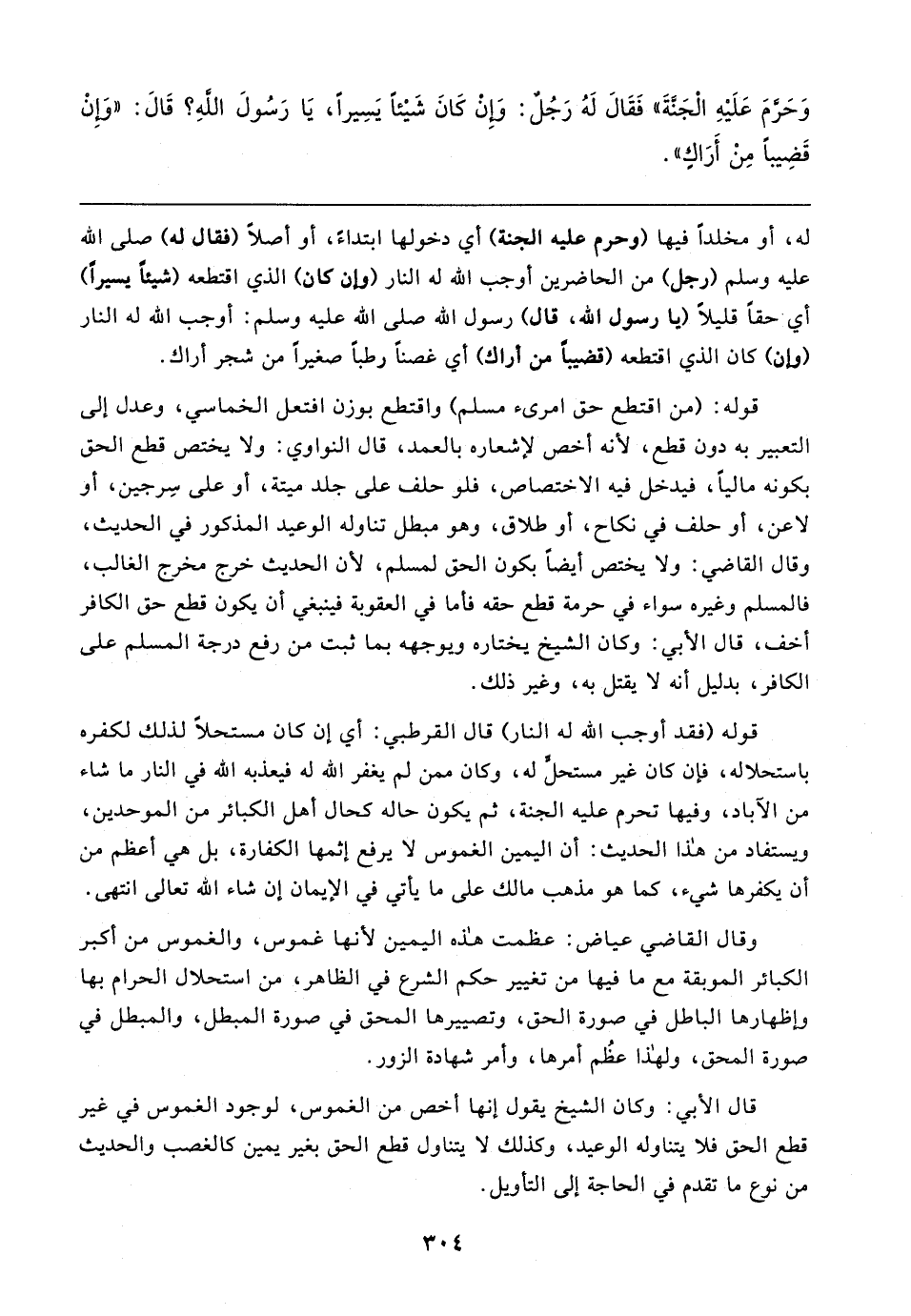 وَحَرَّمَ عَلَيهِ الْجَنَّةَ" فَقَال لَهُ رَجُلٌ: وَإِنْ كَانَ شَيئًا يَسِيرًا، يَا رَسُولَ اللهِ؟ قَال: "وَإِنْ قَضِيبًا مِنْ أَرَاكٍ"
