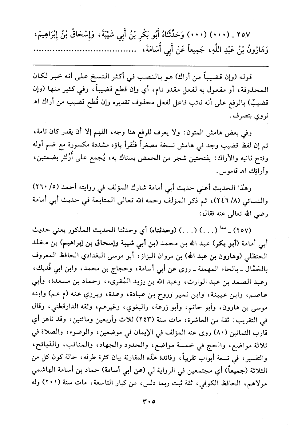 (٢٥٧) - متا (٠٠) (٠٠) (وحدثناه) أي وحدثنا الحديث المذكور يعني حديث أبي أمامة (أبو بكر) عبد الله بن محمد (بن أبي شيبة وإسحاق بن إبراهيم) بن مخلد الحنظلي (وهارون بن عبد الله) بن مروان البزاز، أبو موسى البغدادي الحافظ المعروف بالحَمَّال -بالحاء المهملة- روى عن أبي أسامة، وحجاج بن محمد، وابن أبي فُديك، وعبد الصمد بن عبد الوارث، وعبد الله بن يزيد المُقرئ، وحماد بن مسعدة، وأبي عاصم، وابن عيينة، وابن نمير وروح بن عبادة، وعدة، ويروي عنه (م عم) وابنه موسى بن هارون، وأبو حاتم، وأبو زرعة، والبغوي، وغيرهم، وثقه الدارقطني، وقال في التقريب: ثقة من العاشرة، مات سنة (٢٤٣) ثلاث وأربعين ومائتين، وقد ناهز أي قارب الثمانين (٨٠) روى عنه المؤلف في الإيمان في موضعين، والوضوء، والصلاة في ثلاثة مواضع، والحج في خمسة مواضع، والحدود والجهاد، والمناقب، والذبائح، والتفسير، في تسعة أبواب تقريبًا، وفائدة هذه المقارنة بيان كثرة طرقه، حالة كون كل من الثلاثة (جميعًا) أي مجتمعين في الرواية لي (عن أبي أسامة) حماد بن أسامة الهاشمي مولاهم، الحافظ الكوفي، ثقة ثبت ربما دلس، من كبار التاسعة، مات سنة (٢٠١) وله