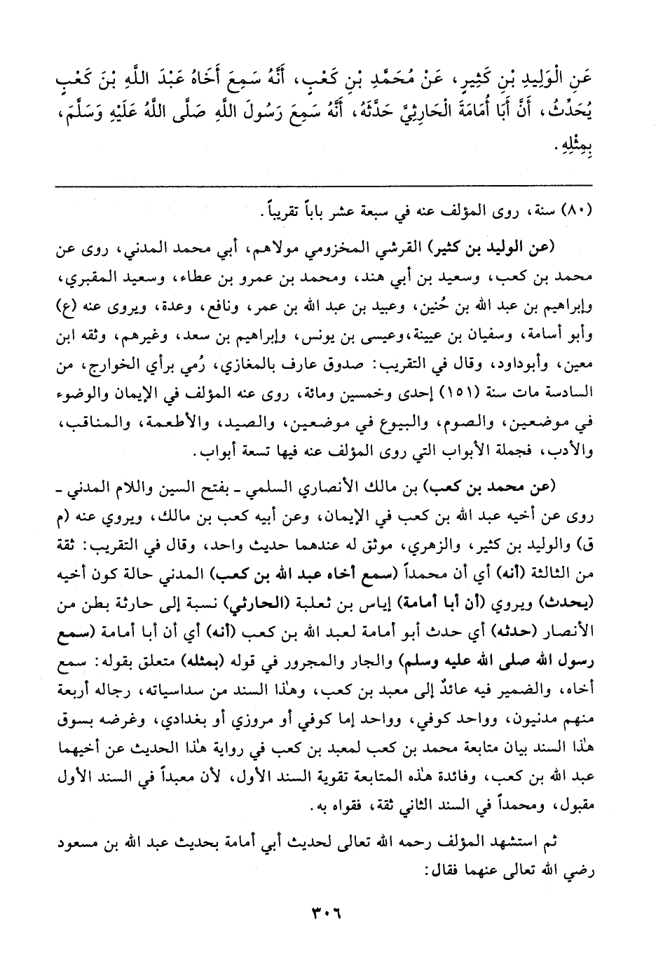 (عن الوليد بن كثير) القرشي المخزومي مولاهم، أبي محمد المدني، روى عن محمد بن كعب، وسعيد بن أبي هند، ومحمد بن عمرو بن عطاء، وسعيد المقبري، وإبراهيم بن عبد الله بن حُنين، وعبيد بن عبد الله بن عمر، ونافع، وعدة، ويروى عنه (ع) وأبو أسامة، وسفيان بن عيينة، وعيسى بن يونس، وإبراهيم بن سعد، وغيرهم، وثقه ابن معين، وأبو داود، وقال في التقريب: صدوق عارف بالمغازي، رُمي برأي الخوارج، من السادسة مات سنة (١٥١) إحدى وخمسين ومائة، روى عنه المؤلف في الإيمان والوضوء في موضعين، والصوم، والبيوع في موضعين، والصيد، والأطعمة، والمناقب، والأدب، فجملة الأبواب التي روى المؤلف عنه فيها تسعة أبواب.