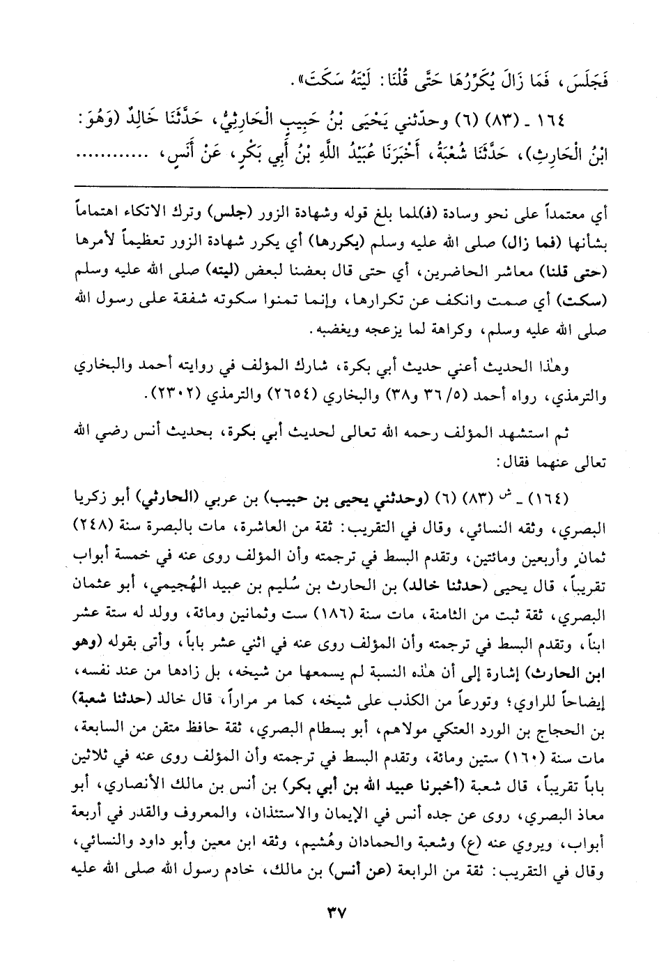 (١٦٤) - ش (٨٣) (٦) (وحدثني يحيى بن حبيب) بن عربي (الحارثيّ) أبو زكريا البَصْرِيّ، وثقه النَّسائيّ، وقال في التقريب: ثِقَة من العاشرة، مات بالبصرة سنة (٢٤٨) ثمانٍ وأربعين ومائتين، وتقدم البسط في ترجمته وأن المؤلف روى عنه في خمسة أبواب تقريبًا، قال يحيى (حَدَّثَنَا خالد) بن الحارث بن سُليم بن عبيد الهُجيمي، أبو عثمان البَصْرِيّ، ثِقَة ثبت من الثامنة، مات سنة (١٨٦) ست وثمانين ومائة، وولد له ستة عشر ابنًا، وتقدم البسط في ترجمته وأن المؤلف روى عنه في اثني عشر بابا، وأتى بقوله (وهو ابن الحارث) إشارة إلى أن هذه النسبة لم يسمعها من شيخه، بل زادها من عند نفسه، إيضاحًا للراوي؛ وتورعًا من الكذب على شيخه، كما مر مرارًا، قال خالد (حَدَّثَنَا شعبة) بن الحجاج بن الورد العتكي مولاهم، أبو بسطام البَصْرِيّ، ثِقَة حافظ متقن من السابعة، مات سنة (١٦٠) ستين ومائة، وتقدم البسط في ترجمته وأن المؤلف روى عنه في ثلاثين بابًا تقريبًا، قال شعبة (أخبرنا عبيد الله بن أبي بكر) بن أنس بن مالك الأَنْصَارِيّ، أبو معاذ البَصْرِيّ، روى عن جده أنس في الإيمان والاستئذان، والمعروف والقدر في أربعة أبواب، ويروي عنه (ع) وشعبة والحمادان وهُشيم، وثقه ابن معين وأبو داود والنَّسائيّ، وقال في التقريب: ثِقَة من الرابعة (عن أنس) بن مالك، خادم رسول الله صلى الله عليه