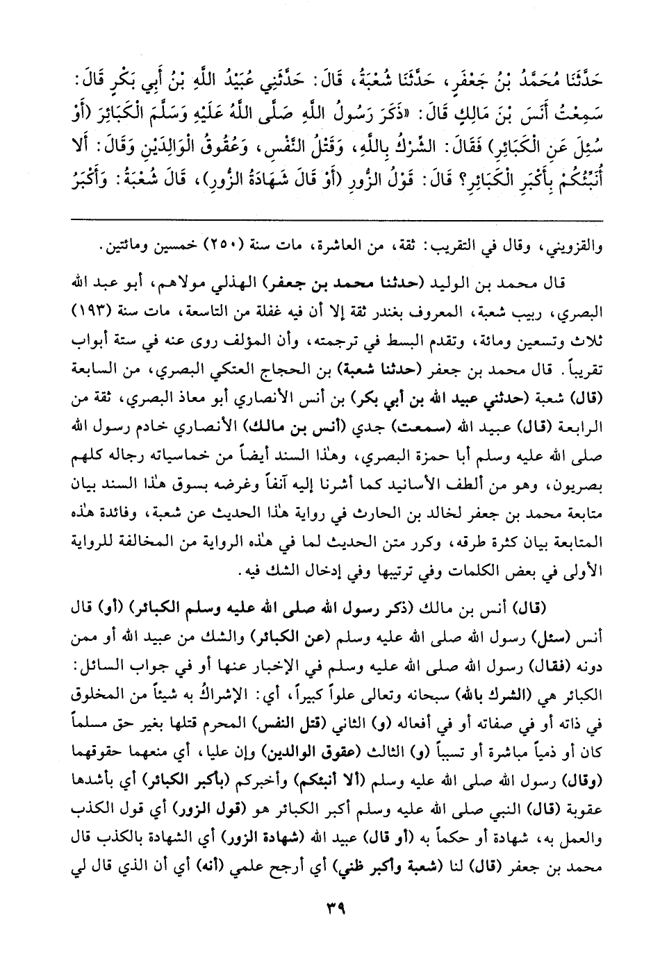 حَدَّثَنَا محمَّدُ بْنُ جَعْفَرٍ، حَدَّثَنَا شُعْبَةُ، قَال: حَدَّثَنِي عُبَيدُ اللهِ بْنُ أَبِي بَكْرٍ قَال: سَمِعْتُ أَنَسَ بْنَ مَالِكٍ قَال: "ذَكَرَ رَسُولُ اللهِ صلى الله عَلَيهِ وَسلمَ الْكَبَائِرَ (أَوْ سُئِلَ عَنِ الْكَبَائِرِ) فَقَال: الشِّرْكُ بِاللَّهِ، وَقَتلُ النَّفْسِ، وَعُقُوقُ الْوَالِدَينِ وَقَال: أَلا أُنَبِّئُكُمْ بِأَكْبَرِ الْكَبَائِرِ؟ قَال: قَوْلُ الزُّورِ (أَوْ قَال شَهَادَةُ الزُّورِ)، قَال شُعْبَةُ: وَأَكْبَرُ