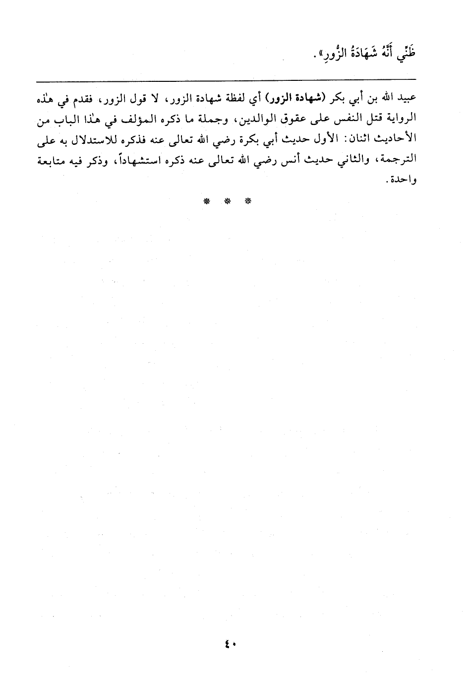 عبيد الله بن أبي بكر (شهادة الزور) أي لفظة شهادة الزور، لا قول الزور، فقدم في هذه الرواية قتل النفس على عقوق الوالدين، وجملة ما ذكره المؤلف في هذا الباب من الأحاديث اثنان: الأول حديث أبي بكرة رضي الله تعالى عنه فذكره للاستدلال به على الترجمة، والثاني حديث أنس رضي الله تعالى عنه ذكره استشهادًا، وذكر فيه متابعة واحدة.