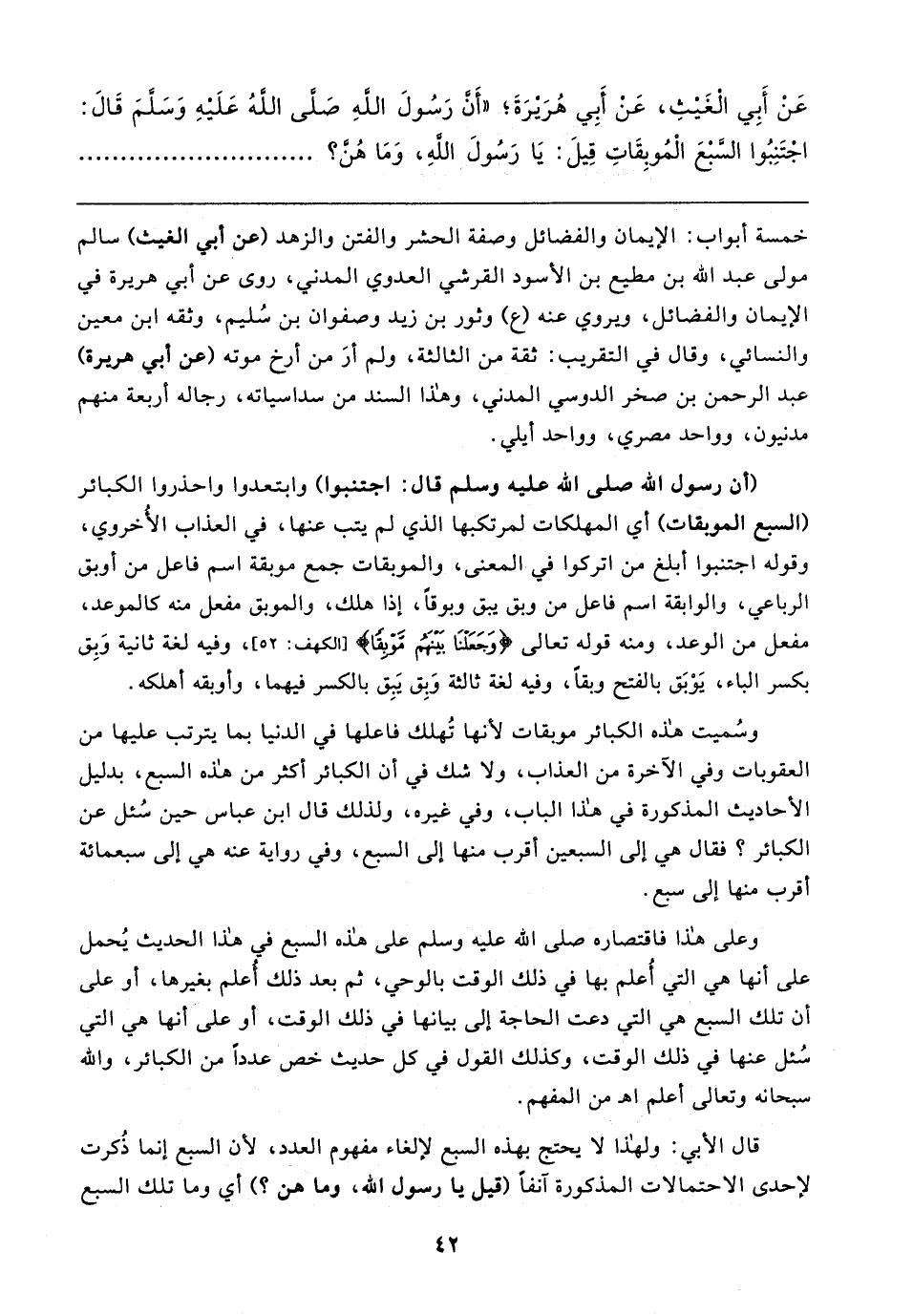 عَنْ أَبِي الْغَيثِ، عَنْ أَبِي هُرَيرَةَ؛ "أَنَّ رَسُولَ اللهِ صَلَّى اللهُ عَلَيهِ وَسلمَ قَال: اجْتَنِبُوا السَّبْعَ الْمُوبِقَاتِ قِيلَ: يَا رَسُولَ اللهِ، وَمَا هُنَّ؟