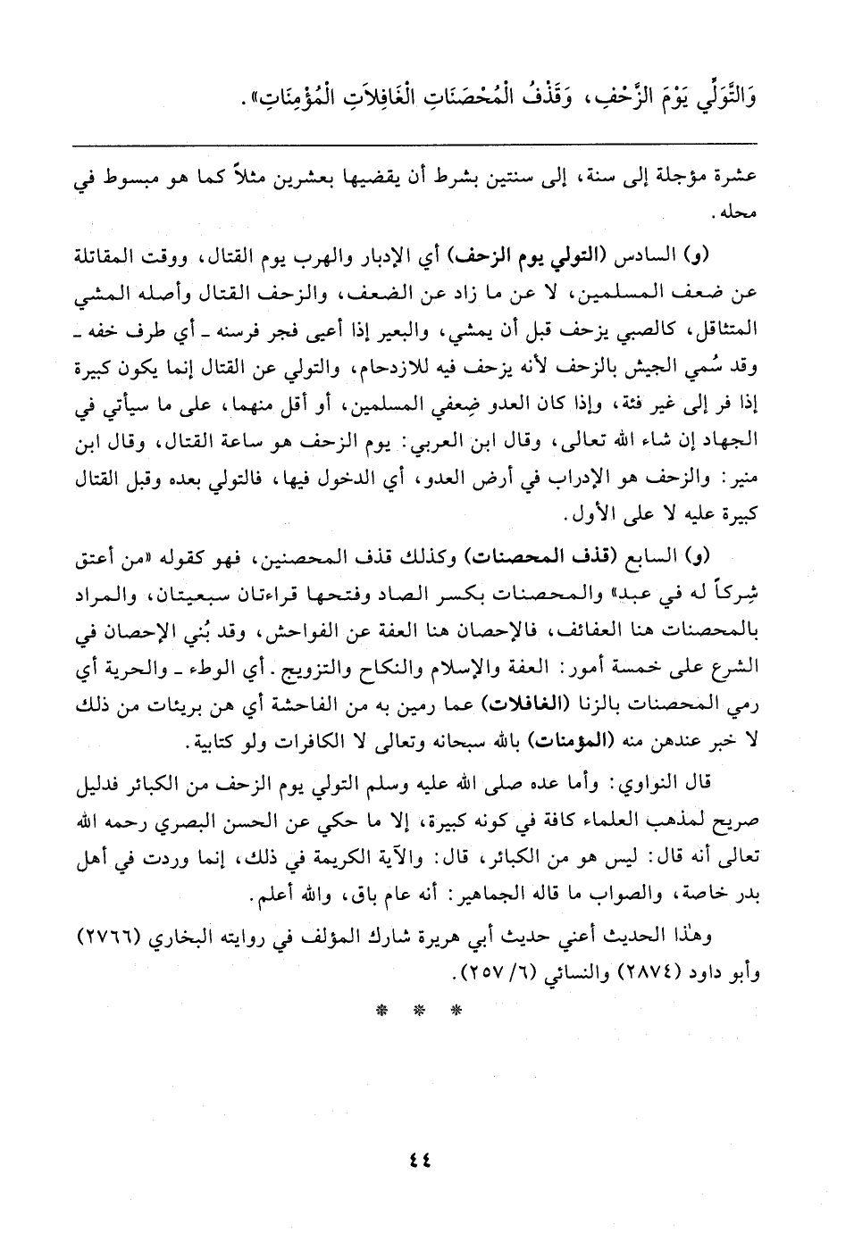 وَالتَّوَلِّي يَوْمَ الزَّحْفِ، وَقَذْفُ الْمُحْصَنَاتِ الْغَافِلَاتِ الْمُؤْمِنَاتِ"