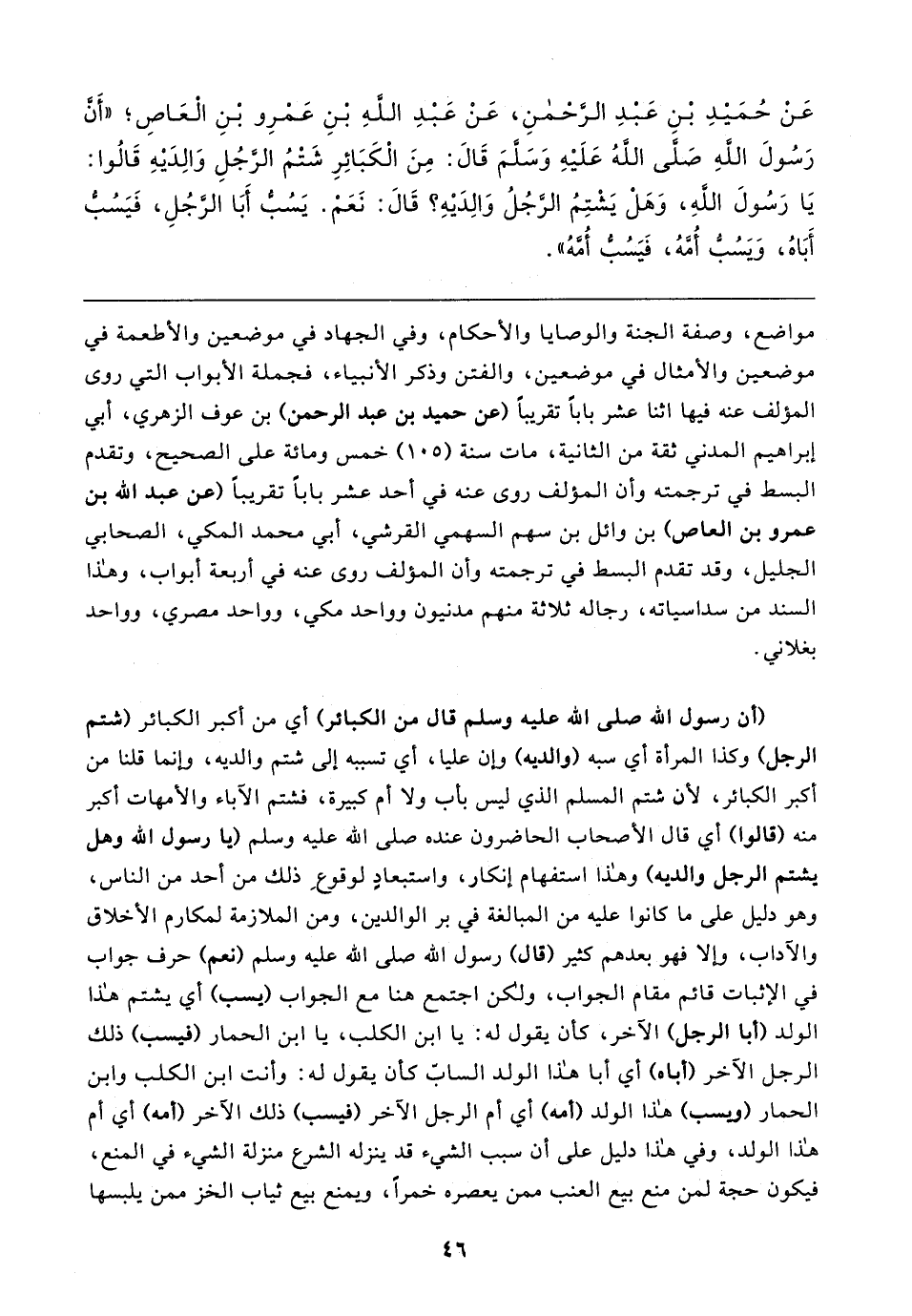 عَنْ حُمَيدِ بْنِ عَبدِ الرَّحْمنِ، عَنْ عَبْدِ اللهِ بْنِ عَمْرِو بْنِ الْعَاصِ؛ "أَنَّ رَسُولَ اللهِ صَلَّى اللهُ عَلَيهِ وَسَلَّمَ قَال: مِنَ الْكَبَائِرِ شَتْمُ الرّجُلِ وَالِدَيهِ قَالُوا: يَا رَسُولَ اللهِ، وَهَلْ يَشْتِمُ الرَّجُلُ وَالِدَيهِ؟ قَال: نَعَمْ. يَسُبُّ أَبَا الرّجُلِ، فَيَسُبُّ أَبَاهُ، وَيَسُبُّ أُمَّهُ، فَيَسُبُّ أُمَّهُ"