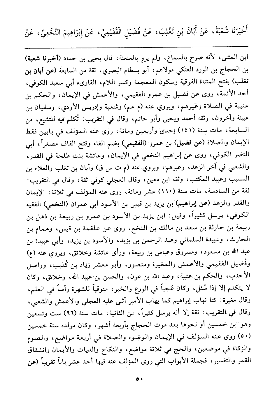 ابن المثنَّى, لأنه صرح بالسماع، ولم يرو بالعنعنة، قال يحيى بن حماد (أخبرنا شعبة) بن الحجاج بن الورد العتكي مولاهم، أبو بسطام البَصْرِيّ، ثِقَة من السابعة (عن أَبان بن تغلب) بفتح المثناة الفوقية وسكون المعجمة وكسر اللام، القارئ أبي سعيد الكُوفيّ، أحد الأئمة، روى عن فضيل بن عمرو الفقيمي، والأعمش في الإيمان, والحكم بن عتيبة في الصلاة وغيرهم، ويروي عنه (م عم) وشعبة وإدريس الأودي، وسفيان بن عيينة وآخرون، وثقه أَحْمد ويحيى وأبو حاتم، وقال في التقريب: مسلم فيه للتشيع، من السابعة، مات سنة (١٤١) إحدى وأربعين ومائة، روى عنه المؤلف في بابين فقط الإيمان والصلاة (عن فضيل) بن عمرو (الفقيمي) بضم الفاء وفتح القاف مصغرًا، أبي النضر الكُوفيّ، روى عن إبراهيم النَّخَعيّ في الإيمان, وعائشة بنت طلحة في القدر، والشعبي في آخر الزهد، وغيرهم، ويروي عنه (م ت س ق) وأبان بن تغلب والعلاء بن المسيّب وعبيد المكتب، وثقه ابن معين، وقال العجلي كُوفِيّ ثِقَة، وقال في التقريب: ثِقَة من السادسة، مات سنة (١١٠) عشر ومائة، روى عنه المؤلف في ثلاثة: الإيمان والقدر والزهد (عن إبراهيم) بن يزيد بن قيس بن الأسود أبي عمران (النَّخَعيّ) الفقيه الكُوفيّ، يرسل كثيرًا، وقيل: ابن يزيد بن الأسود بن عمرو بن ربيعة بن ذهل بن ربيعة بن حارثة بن سعد بن مالك بن النخع، روى عن علقمة بن قيس، وهمام بن الحارث، وعبيدة السلماني وعبد الرَّحْمَن بن يزيد، والأسود بن يزيد، وأبي عبيدة بن عبد الله بن مسعود، ومسروق وعباس بن ربيعة، ورأى عائشة وخلائق، ويروي عنه (ع) وفُضيل الفقيمي والأعمش والمغيرة ومنصور، وأبو معشر زياد بن كُليب، وواصل الأحدب، والحكم بن عتيبة، وعبد الله بن عون، والحسن بن عبيد الله، وخلائق، وكان لا يتكلم إلَّا إذا سُئل، وكان عَجبًا في الورع والخير، متوقيًا للشهرة رأسًا في العلم، وقال مغيرة: كنا نهاب إبراهيم كما يهاب الأمير أثنى عليه العجلي والأعمش والشعبي، وقال في التقريب: ثِقَة إلَّا أنَّه يرسل كثيرًا، من الثَّانية، مات سنة (٩٦) ست وتسعين وهو ابن خمسين أو نحوها بعد موت الحجاج بأربعة أشهر، وكان مولده سنة خمسين (٥٠) روى عنه المؤلف في الإيمان والوضوء والصلاة في أربعة مواضع، والصوم والزكاة في موضعين، والحج في ثلاثة مواضع، والنكاح والديات والأيمان وانشقاق القمر والتفسير، فجملة الأبواب التي روى المؤلف عنه فيها أحد عشر بابًا تقريبًا (عن