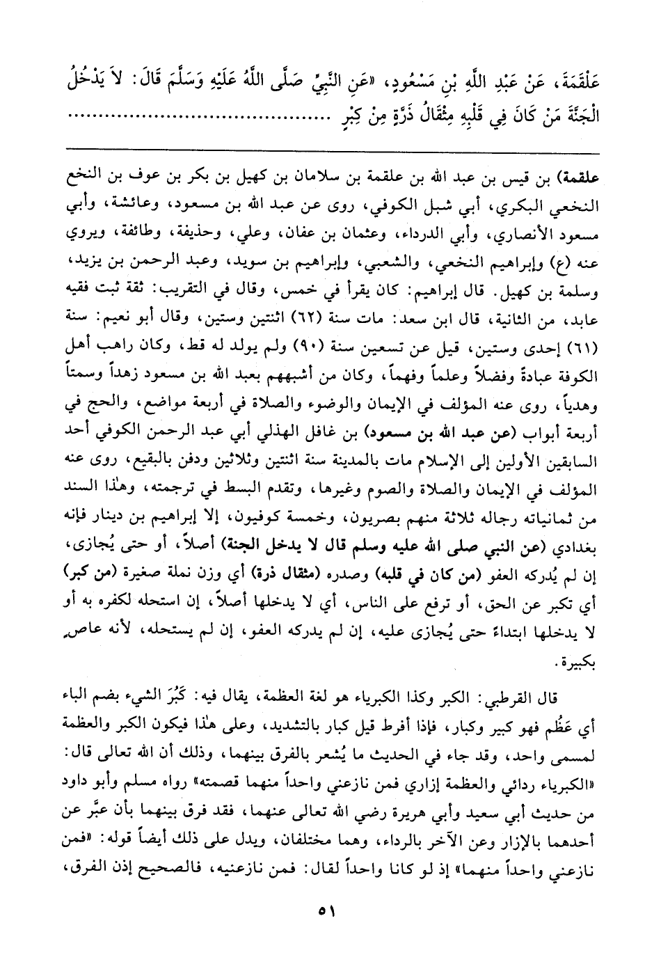 عَلْقَمَةَ، عَنْ عَبْدِ اللهِ بْنِ مَسْعُودٍ، "عَنِ النَّبِيِّ صَلَّى اللهُ عَلَيهِ وَسَلَّمَ قَال: لَا يَدْخُلُ الْجَنَّةَ مَنْ كَانَ فِي قَلْبِهِ مِثْقَالُ ذَرَةٍ مِنْ كِبْرٍ