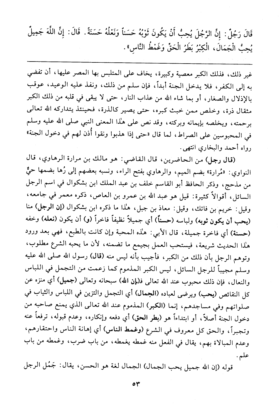 قَال رَجُلٌ: إِن الرَّجُلَ يُحِبُّ أَنْ يَكُونَ ثَوْبُهُ حَسَنًا وَنَعْلُهُ حَسَنَةً. قَال: إِن اللهَ جَمِيلٌ يُحِبُّ الْجَمَال، الْكِبْرُ بَطَرُ الْحَق وَغَمْطُ النَّاسِ"