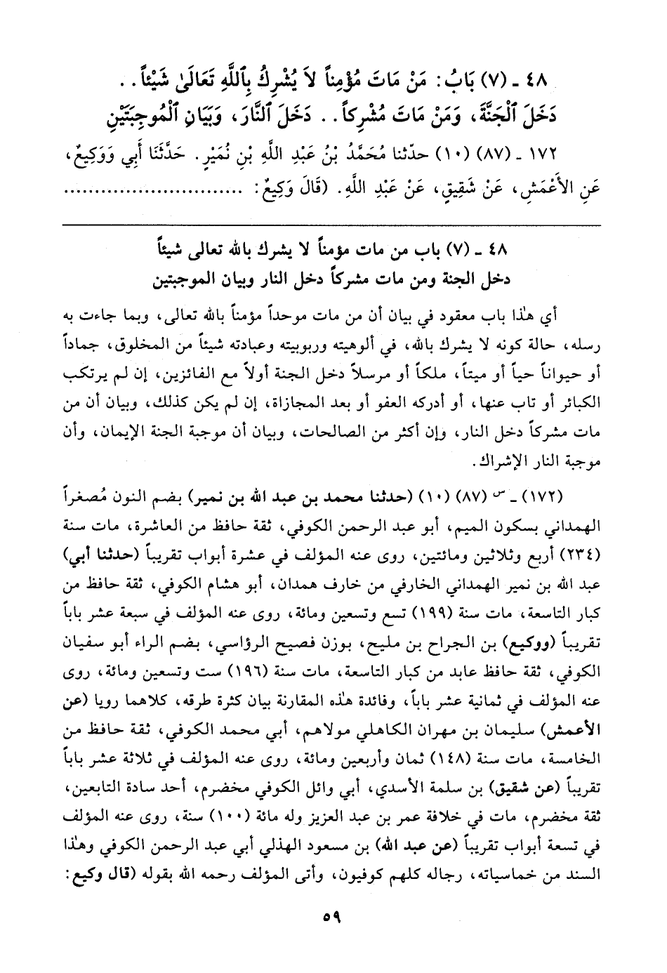١٧٢ - (٨٧) (١٠) حدَّثنا مُحَمَّدُ بْنُ عَبْدِ اللهِ بْنِ نُمَيرٍ. حَدَّثَنَا أَبِي وَوَكِيعٌ، عَنِ الأعمَشِ، عَنْ شَقِيقٍ، عَنْ عَبْدِ اللهِ. (قَال وَكِيعٌ: