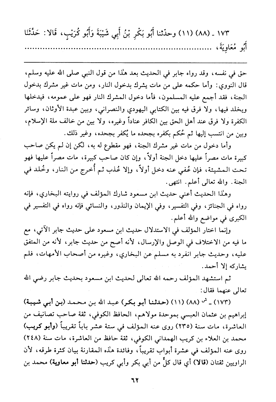 (١٧٣) - ش (٨٨) (١١) (حدثنا أبو بكر) عبد الله بن محمد (بن أبي شيبة) إبراهيم بن عثمان العبسي بموحهدة مولاهم، الحافظ الكوفي، ثقة صاحب تصانيف من العاشرة، مات سنة (٢٣٥) روى عنه المؤلف في ستة عشر بابًا تقريبًا (وأبو كريب) محمد بن العلاء بن كريب الهمداني الكوفي، ثقة حافظ من العاشرة، مات سنة (٢٤٨) روى عنه المؤلف في عشرة أبواب تقريبًا، وفائدة هذه المقارنة بيان كثرة طرقه، لأن الراويين ثقتان (قالا) أي قال كلٌّ من أبي بكر وأبي كريب (حدثنا أبو معاوية) محمد بن
