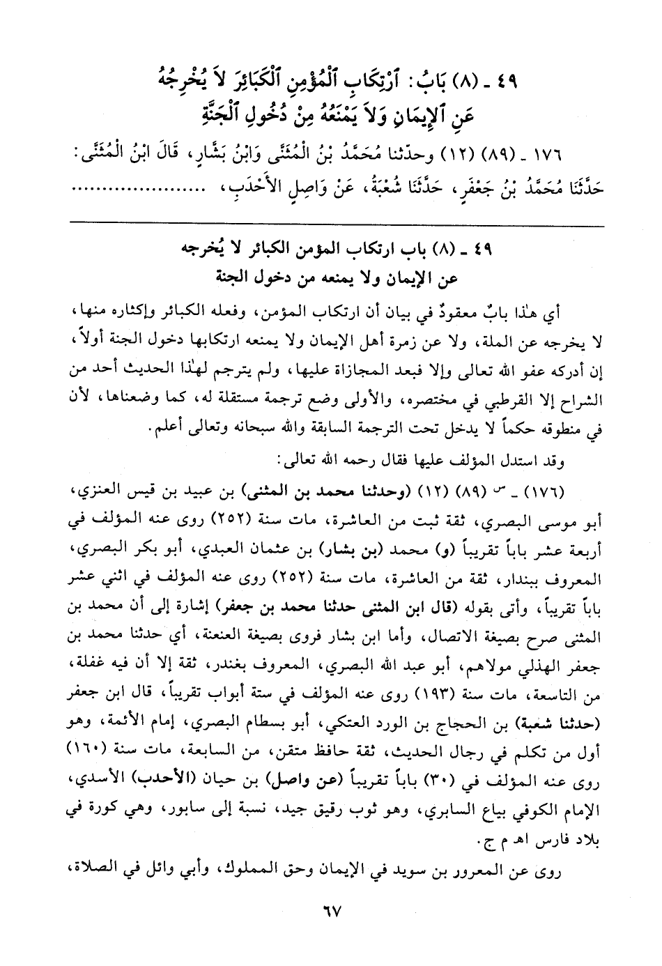 ٤٩ - (٨) بَابُ: ارْتِكَابِ الْمُؤْمِنِ الْكَبَائِرَ لَا يُخْرِجُهُ عَنِ الإِيمَانِ وَلَا يَمْنَعُهُ مِنْ دُخُولِ الْجَنَّةِ