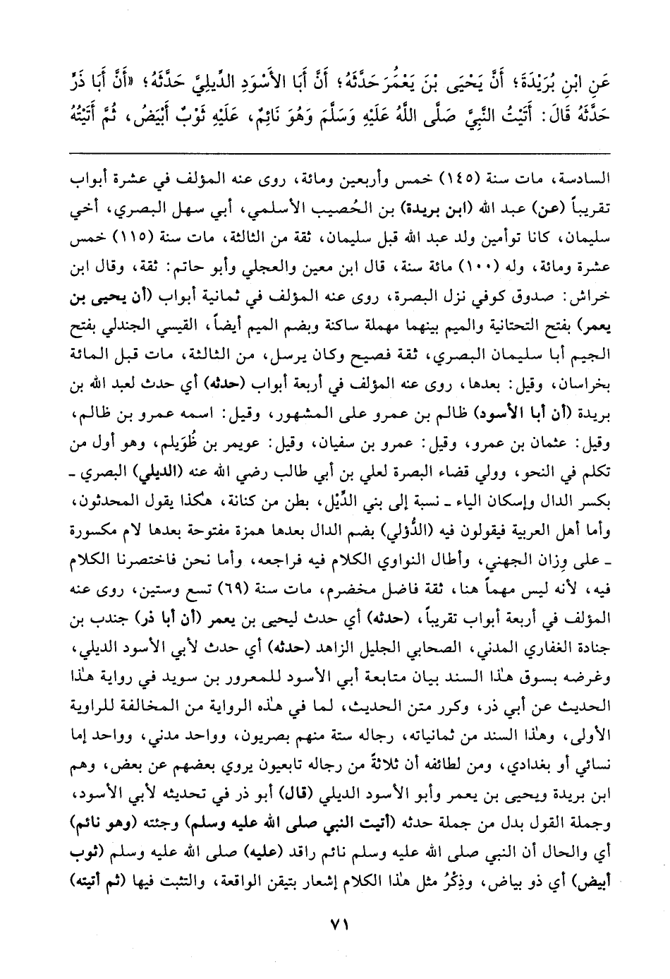 عَنِ ابْنِ بُرَيدَةَ؛ أَنْ يَحْيَى بْنَ يَعْمُرَ حَدَّثَهُ؛ أَن أَبَا الأسْوَدِ الدِّيلِيَّ حَدَّثَهُ؛ "أَن أَبَا ذَرٍّ حَدَّثَهُ قَال: أَتَيتُ النَّبِيَّ صَلَّى اللهُ عَلَيهِ وَسَلَّمَ وَهُوَ نَائِمٌ، عَلَيهِ ثَوْبٌ أَبْيَضُ، ثُمَّ أَتَيتُهُ