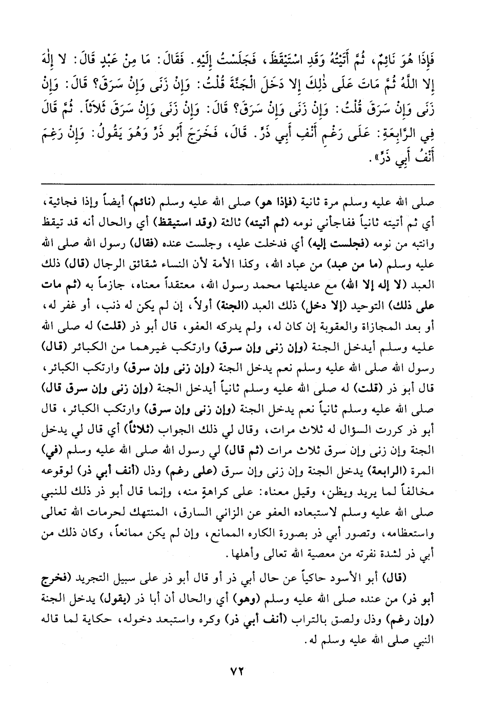 فَإِذَا هُوَ نَائِمٌ، ثُمَّ أَتَيتُهُ وَقَدِ اسْتَيقَظَ، فَجَلَسْتُ إِلَيهِ. فَقَال: مَا مِنْ عَبْدٍ قَال: لا إِلهَ إِلا اللهُ ثُمَّ مَاتَ عَلَى ذلِكَ إِلا دَخَلَ الْجَنَّةَ قُلْتُ: وَإِنْ زَنَى وَإِنْ سَرَقَ؟ قَال: وَإِنْ زَنَى وَإنْ سَرَقَ قُلْتُ: وَإنْ زَنَى وَإِنْ سَرَقَ؟ قَال: وَإِنْ زَنَى وَإِنْ سَرَقَ ثَلاثًا. ثُمَّ قَال فِي الرَّابِعَةِ: عَلَى رَغْمِ أَنْفِ أَبِي ذَرٍّ. قَال، فَخَرَجَ أَبُو ذَرٍّ وَهُوَ يَقُولُ: وَإنْ رَغِمَ أَنْفُ أَبِي ذَرٍّ"