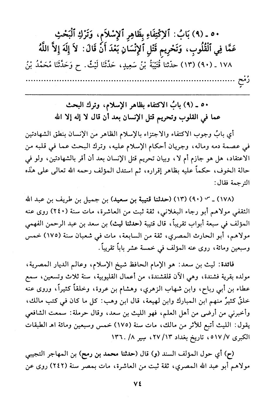 ٥٠ - (٩) بَابُ: الاكْتِفَاءِ بِظَاهِرِ الإِسْلام، وَتَرْكِ الْبَحْثِ عَمَّا فِي الْقُلُوبِ، وَتَحْرِيمِ قَتْلِ الإِنْسَانِ بَعْدَ أَن قَال: لَا إِلَهَ إِلَّا اللَّهُ