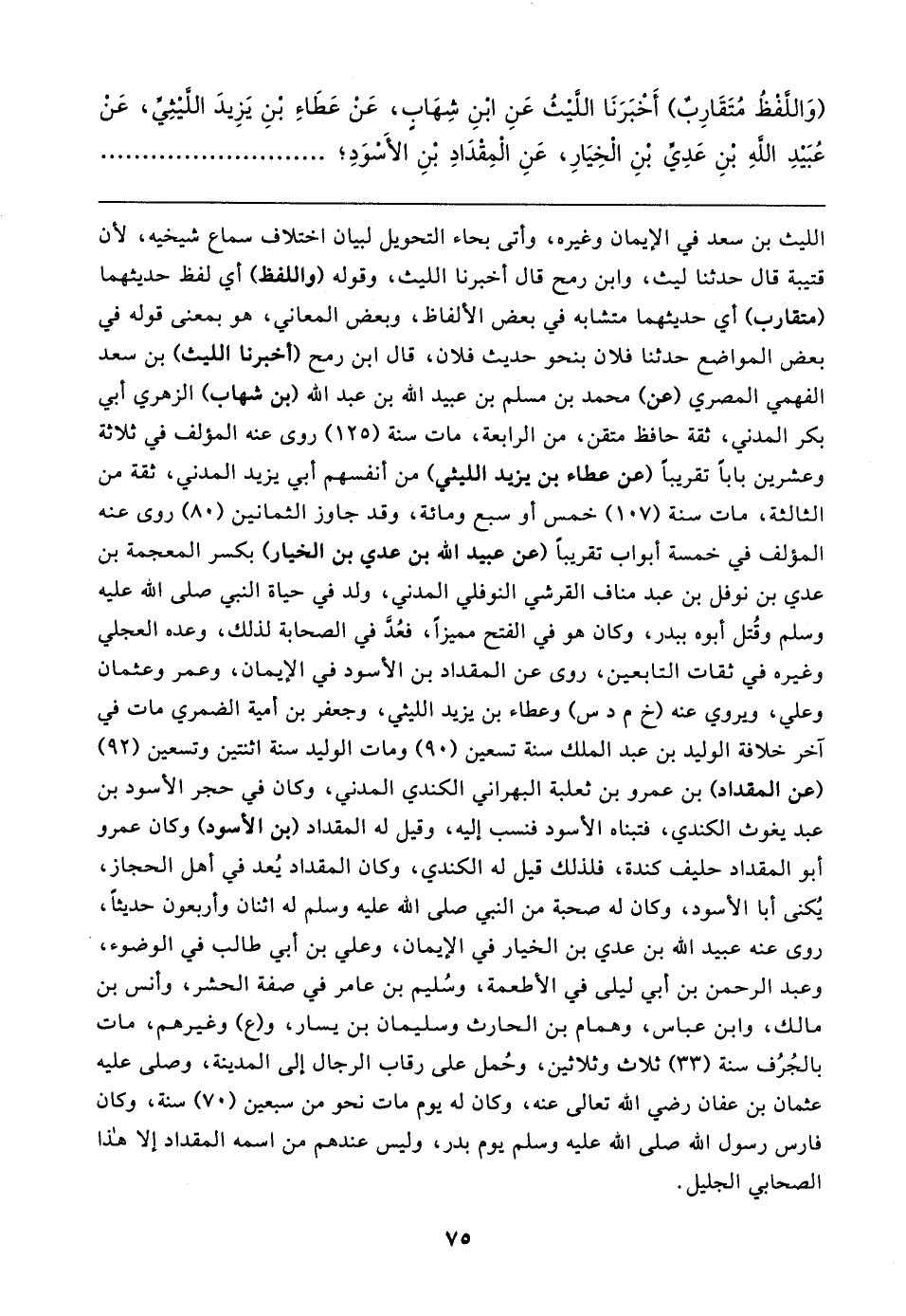 الليث بن سعد في الإيمان وغيره، وأتى بحاء التحويل لبيان اختلاف سماع شيخيه، لأن قتيبة قال حدثنا ليث، وابن رمح قال أخبرنا الليث، وقوله (واللفظ) أي لفظ حديثهما (متقارب) أي حديثهما منشابه في بعض الألفاظ، وبعض المعاني، هو بمعنى قوله في بعض المواضع حدثنا فلان بنحو حديث فلان، قال ابن رمح (أخبرنا الليث) بن سعد الفهمي المصري (عن) محمد بن مسلم بن عبيد الله بن عبد الله (بن شهاب) الزهري أبي بكر المدني، ثقة حافظ متقن، من الرابعة، مات سنة (١٢٥) روى عنه المؤلف في ثلاثة وعشرين بابًا تقريبًا (عن عطاء بن يزيد الليثي) من أنفسهم أبي يزيد المدني، ثقة من الثالثة، مات سنة (١٠٧) خمس أو سبع ومائة، وقد جاوز الثمانين (٨٠) روى عنه المؤلف في خمسة أبواب تقريبًا (عن عبيد الله بن عدي بن الخيار) بكسر المعجمة بن عدي بن نوفل بن عبد مناف القرشي النوفلي المدني، ولد في حياة النبي صلى الله عليه وسلم وقُتل أبوه ببدر، وكان هو في الفتح مميزًا، فعُدَّ في الصحابة لذلك، وعده العجلي وغيره في ثقات التابعين، روى عن المقداد بن الأسود في الإيمان، وعمر وعثمان وعلي، ويروي عنه (خ م د س) وعطاء بن يزيد الليثي، وجعفر بن أمية الضمري مات في آخر خلافة الوليد بن عبد الملك سنة تسعين (٩٠) ومات الوليد سنة اثنتين وتسعين (٩٢) (عن المقداد) بن عمرو بن ثعلبة البهراني الكندي المدني، وكان في حجر الأسود بن عبد يغوث الكندي، فتبناه الأسود فنسب إليه، وقيل له المقداد (بن الأسود) وكان عمرو أبو المقداد حليف كندة، فلذلك قيل له الكندي، وكان المقداد يُعد في أهل الحجاز، يُكنى أبا الأسود، وكان له صحبة من النبي صلى الله عليه وسلم له اثنان وأربعون حديثًا، روى عنه عبيد الله بن عدي بن الخيار في الإيمان، وعلي بن أبي طالب في الوضوء، وعبد الرحمن بن أبي ليلى في الأطعمة، وسُليم بن عامر في صفة الحشر، وأنس بن مالك، وابن عباس، وهمام بن الحارث وسليمان بن يسار، و (ع) وغيرهم، مات بالجُرُف سنة (٣٣) ثلاث وثلاثين، وحُمل على رقاب الرجال إلى المدينة، وصلى عليه عثمان بن عفان رضي الله تعالى عنه، وكان له يوم مات نحو من سبعين (٧٠) سنة، وكان فارس رسول الله صلى الله عليه وسلم يوم بدر، وليس عندهم من اسمه المقداد إلا هذا الصحابي الجليل.