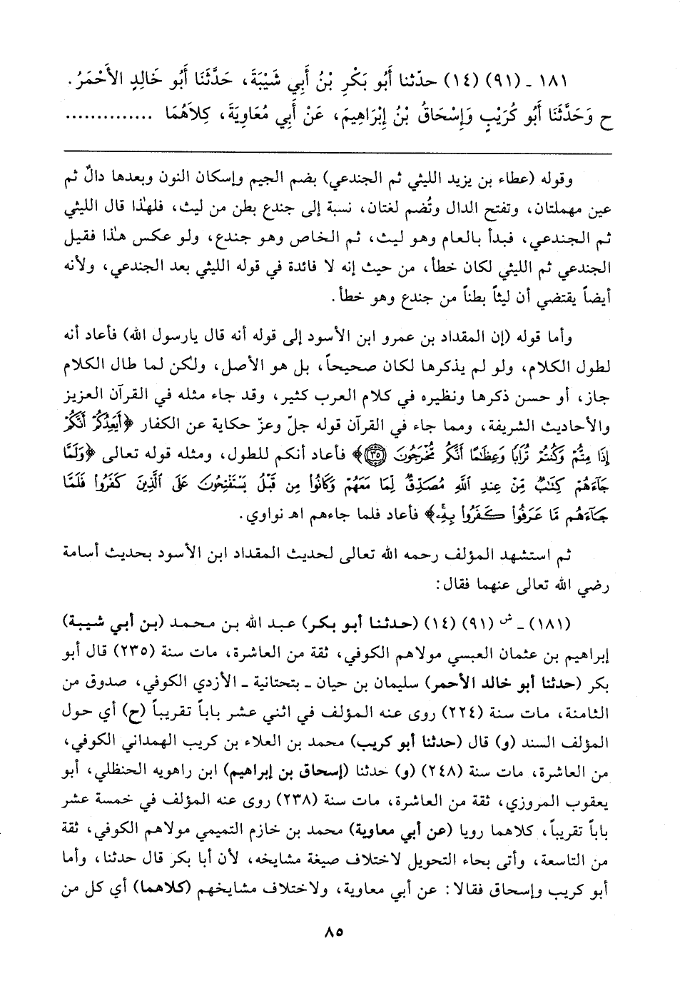 ١٨١ - (٩١) (١٤) حدَّثنا أَبُو بَكْرِ بْنُ أَبِي شَيبَةَ، حَدَّثَنَا أَبُو خَالِدِ الأَحْمَرُ.