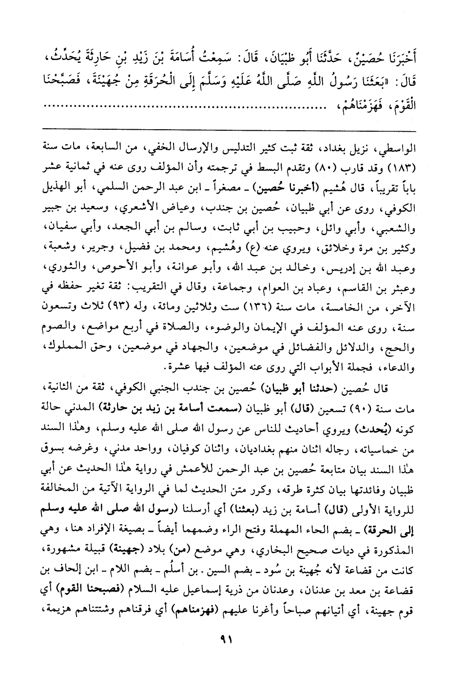 أَخْبَرَنَا حُصَينٌ، حَدَّثَنَا أَبُو ظبْيَانَ، قَال: سَمِعْتُ أُسَامَةَ بْنَ زَيدِ بْنِ حَارِثَةَ يُحَدِّثُ، قَال: "بَعَثَنَا رَسُولُ اللهِ صَلَّى اللهُ عَلَيهِ وَسَلَّمَ إِلَى الْحُرَقَةِ مِنْ جُهَينَةَ، فَصَبَّحْنَا الْقَوْمَ، فَهَزَمْنَاهُمْ،