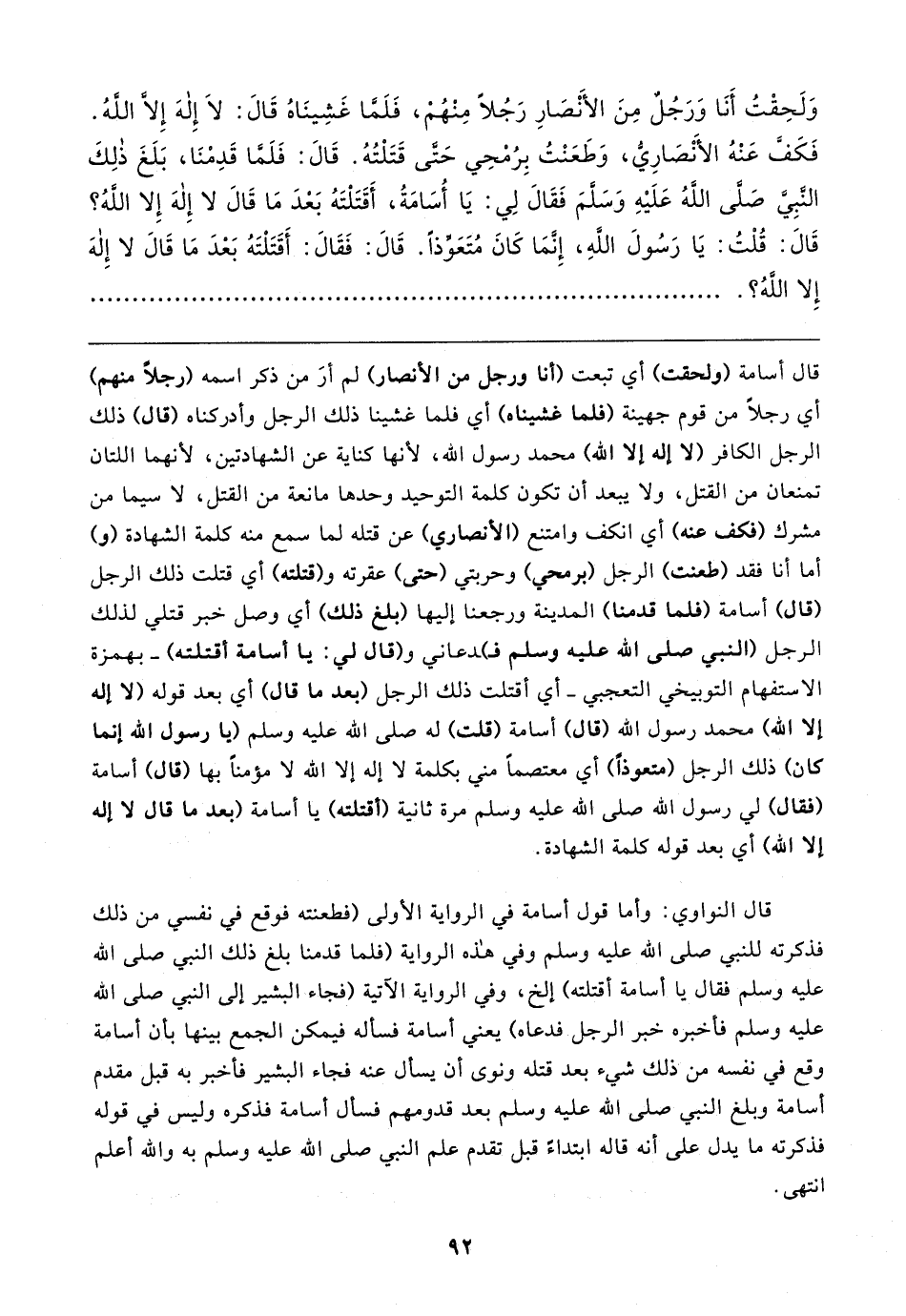 وَلَحِقْتُ أَنَا وَرَجُلٌ مِنَ الأنْصَارِ رَجُلًا مِنْهُمْ، فَلَمَّا غَشِينَاهُ قَال: لَا إِلهَ إلا اللهُ. فَكَفَّ عَنْهُ الأَنْصَارِيُّ، وَطَعَنْتُ بِرُمْحِي حَتَّى قَتَلْتُهُ. قَال: فَلَمَّا قَدِمْنَا، بَلَغَ ذلِكَ النَّبِيَّ صَلَّى اللهُ عَلَيهِ وَسَلَّمَ فَقَال لِي: يَا أُسَامَةُ، أَقَتَلْتَهُ بَعْدَ مَا قَال لا إِلهَ إِلا اللهُ؟ قَال: قُلْتُ: يَا رَسُولَ اللهِ، إِثَّمَا كَانَ مُتَعَوِّذًا. قَال: فَقَال: أَقَتَلْتَهُ بَعْدَ مَا قَال لا إِلهَ إِلا اللهُ؟