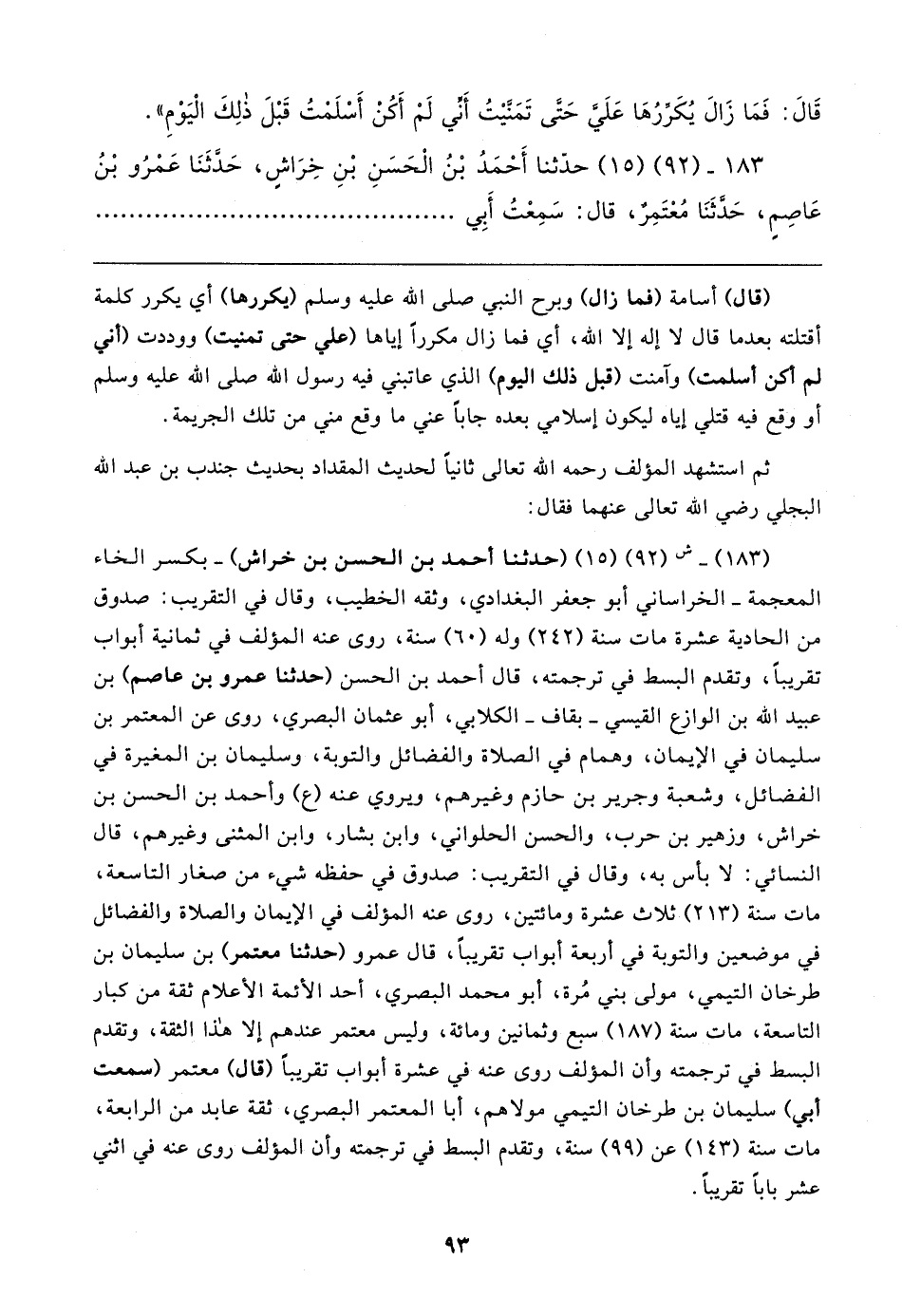(١٨٣) - ش (٩٢) (١٥) (حدثنا أحمد بن الحسن بن خراش) -بكسر الخاء المعجمة- الخراساني أبو جعفر البغدادي، وثقه الخطيب، وقال في التقريب: صدوق من الحادية عشرة مات سنة (٢٤٢) وله (٦٠) سنة، روى عنه المؤلف في ثمانية أبواب تقريبًا، وتقدم البسط في ترجمته، قال أحمد بن الحسن (حدثنا عمرو بن عاصم) بن عبيد الله بن الوازع القيسي -بقاف- الكلابي، أبو عثمان البصري، روى عن المعتمر بن سليمان في الإيمان، وهمام في الصلاة والفضائل والتوبة، وسليمان بن المغيرة في الفضائل، وشعبة وجرير بن حازم وغيرهم، ويروي عنه (ع) وأحمد بن الحسن بن خراش، وزهير بن حرب، والحسن الحلواني، وابن بشار، وابن المثنى وغيرهم، قال النسائي: لا بأس به، وقال في التقريب: صدوق في حفظه شيء من صغار التاسعة، مات سنة (٢١٣) ثلاث عشرة ومائتين، روى عنه المؤلف في الإيمان والصلاة والفضائل في موضعين والتوبة في أربعة أبواب تقريبًا، قال عمرو (حدثنا معتمر) بن سليمان بن طرخان التيمي، مولى بني مُرة، أبو محمد البصري، أحد الأئمة الأعلام ثقة من كبار التاسعة، مات سنة (١٨٧) سبع وثمانين ومائة، وليس معتمر عندهم إلا هذا الثقة، وتقدم البسط في ترجمته وأن المؤلف روى عنه في عشرة أبواب تقريبًا (قال) معتمر (سمعت أبي) سليمان بن طرخان التيمي مولاهم، أبا المعتمر البصري، ثقة عابد من الرابعة، مات سنة (١٤٣) عن (٩٩) سنة، وتقدم البسط في ترجمته وأن المؤلف روى عنه في اثني عشر بابًا تقريبًا.