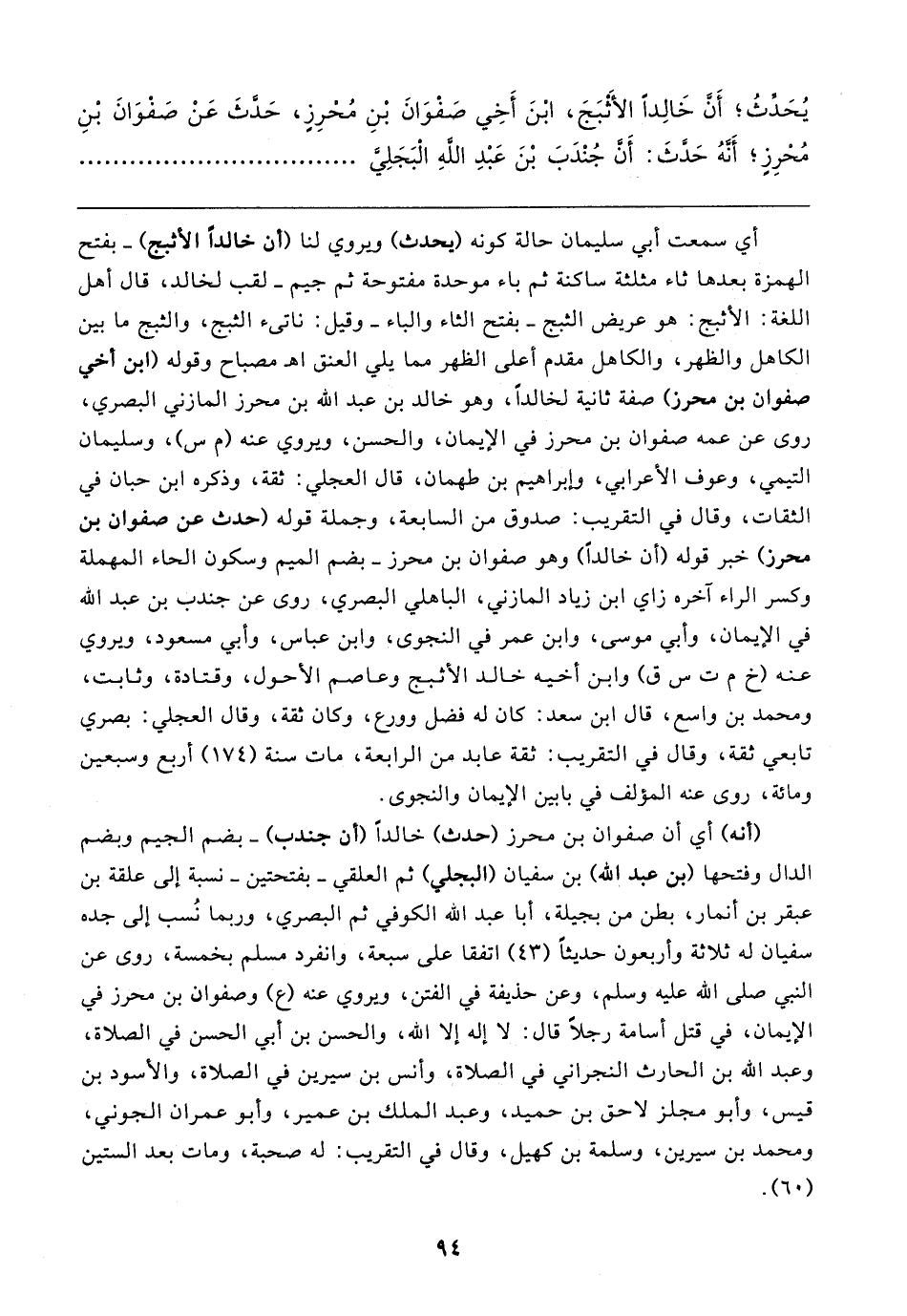 أي سمعت أبي سليمان حالة كونه (يحدث) ويروي لنا (أن خالدًا الأثبج) -بفتح الهمزة بعدها شاء مثلثة ساكنة ثم باء موحدة مفتوحة ثم جيم- لقب لخالد، قال أهل اللغة: الأثبج: هو عريض الثبج -بفتح الثاء والباء- وقيل: ناتئ الثبج، والثبج ما بين الكاهل والظهر، والكاهل مقدم أعلى الظهر مما يلي العنق اهـ مصباح وقوله (ابن أخي صفوان بن محرز) صفة ثانية لخالدا، وهو خالد بن عبد الله بن محرز المازني البصري، روى عن عمه صفوان بن محرز في الإيمان، والحسن، ويروي عنه (م س)، وسليمان التيمي، وعوف الأعرابي، وإبراهيم بن طهمان، قال العجلي: ثقة، وذكره ابن حبان في الثقات، وقال في التقريب: صدوق من السابعة، وجملة قوله (حدث عن صفوان بن محرز) خبر قوله (أن خالدًا) وهو صفوان بن محرز -بضم الميم وسكون الحاء المهملة وكسر الراء آخره زاي ابن زياد المازني، الباهلي البصري، روى عن جندب بن عبد الله في الإيمان، وأبي موسى، وابن عمر في النجوى، وابن عباس، وأبي مسعود، ويروي عنه (خ م ت س ق) وابن أخيه خالد الأثبج وعاصم الأحول، وقتادة، وثابت، ومحمد بن واسع، قال ابن سعد: كان له فضل وورع، وكان ثقة، وقال العجلي: بصري تابعي ثقة، وقال في التقريب: ثقة عابد من الرابعة، مات سنة (١٧٤) أربع وسبعين ومائة، روى عنه المؤلف في بابين الإيمان والنجوى.