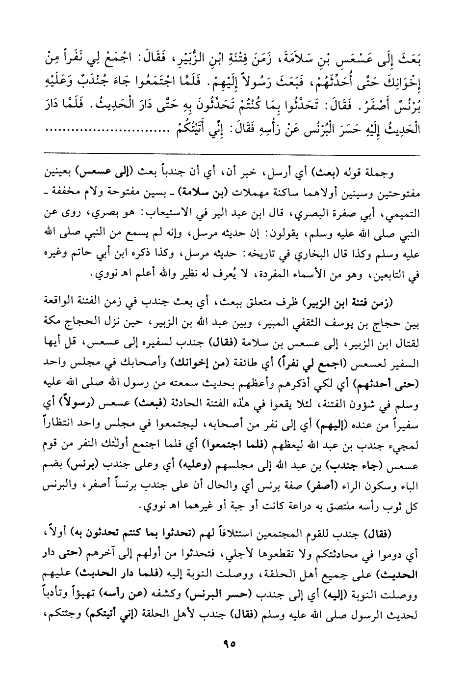 وجملة قوله (بعث) أي أرسل، خبر أن، أي أن جندبًا بعث (إلى عسعس) بعينين مفتوحتين وسينين أولاهما ساكنة مهملات (بن سلامة) -بسين مفتوحة ولام مخففة- التميمي، أبي صفرة البصري، قال ابن عبد البر في الاستيعاب: هو بصري، روى عن النبي صلى الله عليه وسلم، يقولون: إن حديثه مرسل، وإنه لم يسمع من النبي صلى الله عليه وسلم وكذا قال البخاري في تاريخه: حديثه مرسل، وكذا ذكره ابن أبي حاتم وغيره في التابعين، وهو من الأسماء المفردة، لا يُعرف له نظير والله أعلم اهـ نووي.