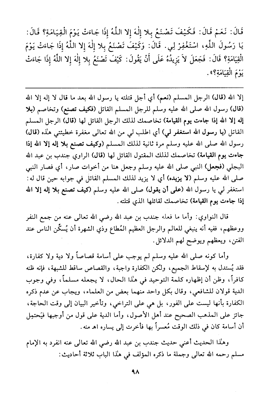 إلا الله (قال) الرجل المسلم (نعم) أي أجل قتلته يا رسول الله بعد ما قال لا إله إلا الله (قال) رسول الله صلى الله عليه وسلم للرجل المسلم القاتل (فكيف تصنع) وتخاصم (بلا إله إلا الله إذا جاءت يوم القيامة) تخاصمك لذلك الرجل القائل لها (قال) الرجل المسلم القاتل (يا رسول الله استغفر لي) أي اطلب لي من الله تعالى مغفرة خطيئتي هذه (قال) رسول الله صلى الله عليه وسلم مرة ثانية لذلك المسلم (وكيف تصنع بلا إله إلا الله إذا جاءت يوم القيامة) تخاصمك لذلك المقتول القائل لها (قال) الراوي جندب بن عبد الله البجلي (فجعل) النبي صلى الله عليه وسلم وجعل هنا من أخوات صار، أي فصار النبي صلى الله عليه وسلم (لا يزيده) أي لا يزيد لذلك المسلم القاتل في جوابه حين قال له: استغفر لي يا رسول الله (على أن يقول) صلى الله عليه وسلم (كيف تصنع بلا إله إلا الله إذا جاءت يوم القيامة) تخاصمك لقائلها الذي قتلته.