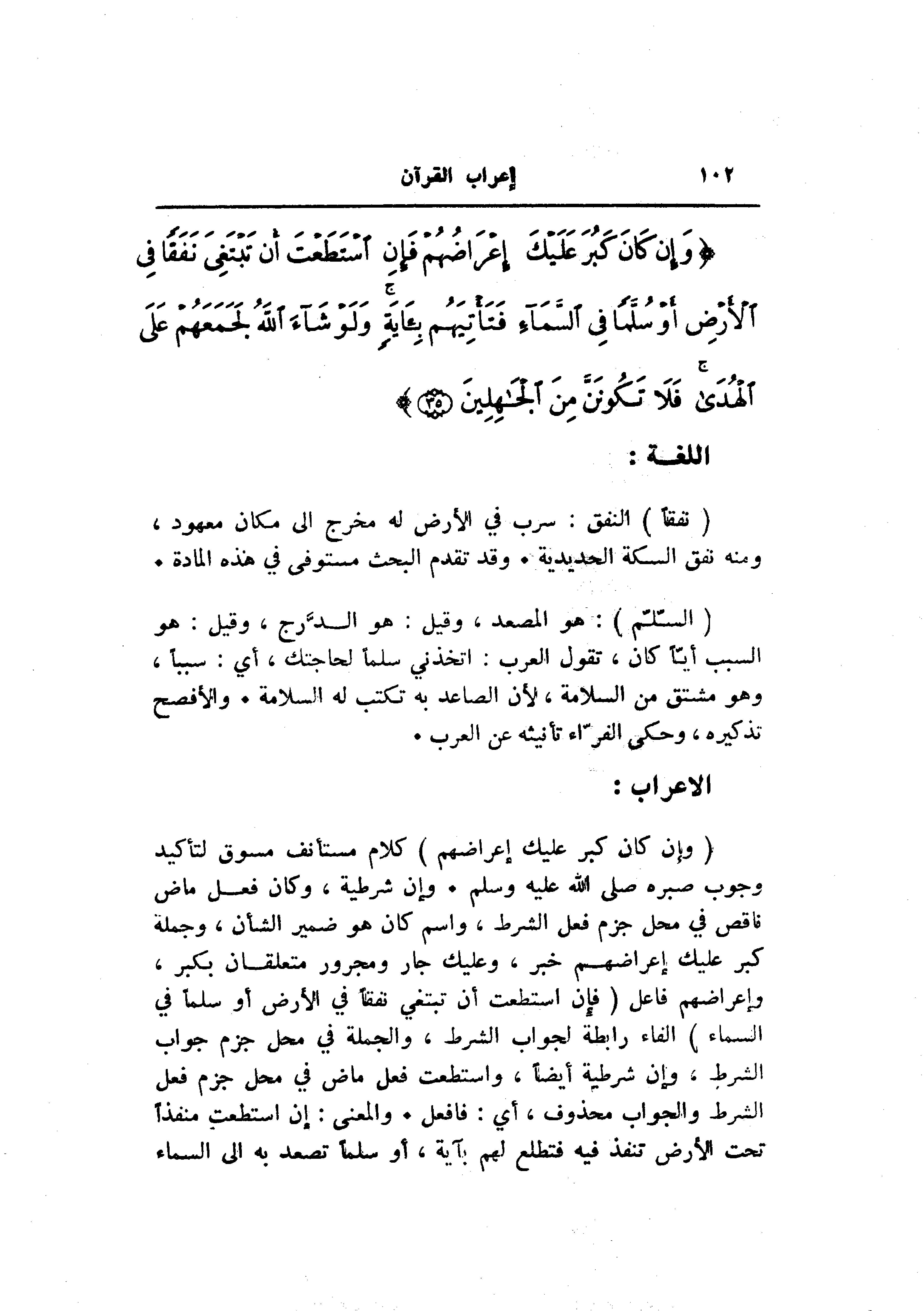 (وَإِنْ كانَ كَبُرَ عَلَيْكَ إِعْراضُهُمْ) كلام مستأنف مسوق لتأكيد وجوب صبره صلى الله عليه وسلم. وإن شرطية، وكان فعل ماض ناقص في محل جزم فعل الشرط، واسم كان هو ضمير الشأن، وجملة كبر عليك إعراضهم خبر، وعليك جار ومجرور متعلقان بكبر، وإعراضهم فاعل (فَإِنِ اسْتَطَعْتَ أَنْ تَبْتَغِيَ نَفَقاً فِي الْأَرْضِ أَوْ سُلَّماً فِي السَّماءِ) الفاء رابطة لجواب الشرط، والجملة في محل جزم جواب الشرط، وإن شرطية أيضا، واستطعت فعل ماض في محل جزم فعل الشرط والجواب محذوف، أي: فافعل. والمعنى: إن استطعت منفذا تحت الأرض تنفذ فيه فتطلع لهم بآية، أو سلما تصعد به الى السماء