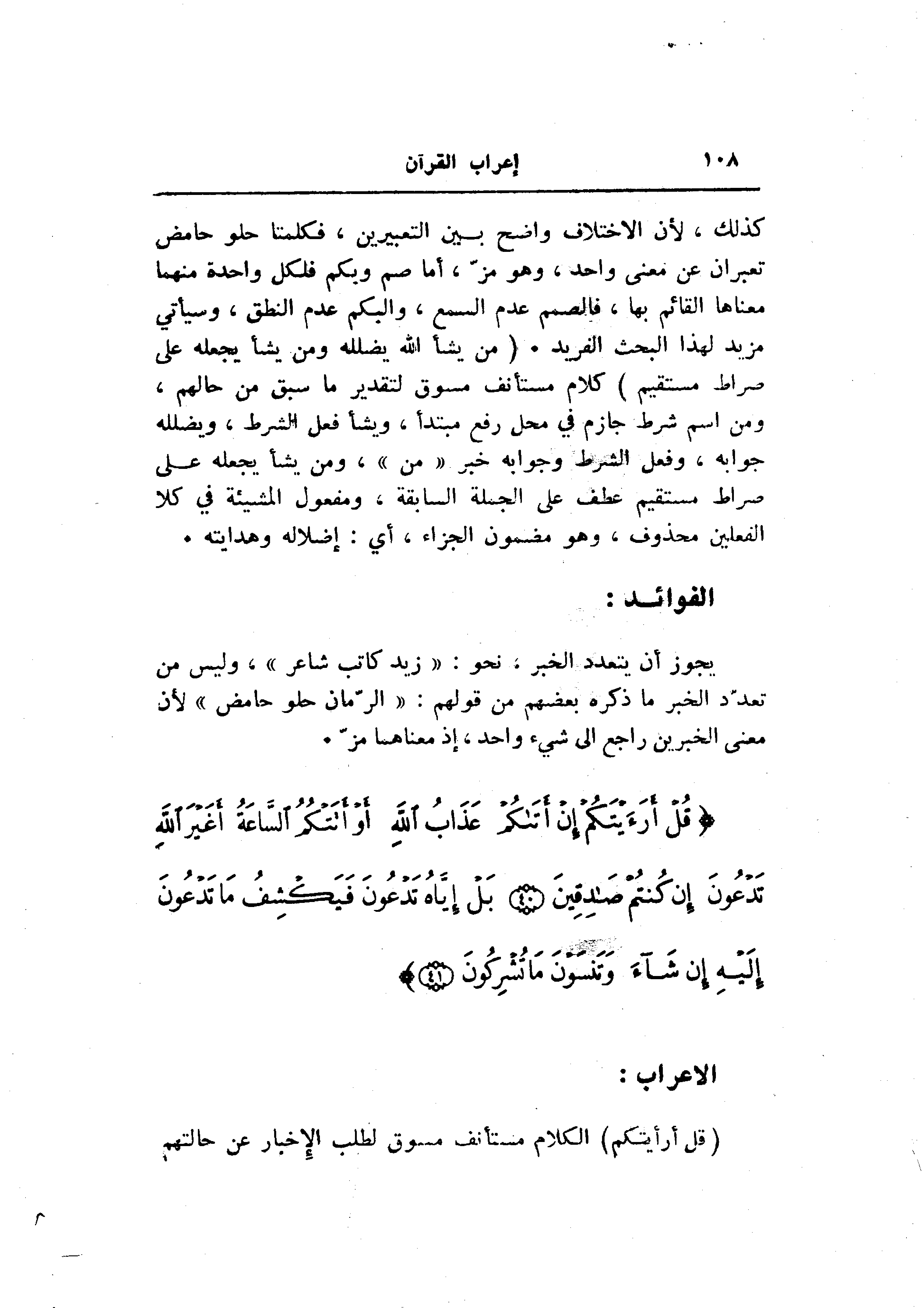 كذلك، لأن الاختلاف واضح بين التعبيرين، فكلمتا حلو حامض تعبران عن معنى واحد، وهو مزّ، أما صم وبكم فلكل واحدة منهما معناها القائم بها، فالصمم عدم السمع، والبكم عدم النطق، وسيأتي مزيد لهذا البحث الفريد. (مَنْ يَشَأِ اللَّهُ يُضْلِلْهُ وَمَنْ يَشَأْ يَجْعَلْهُ عَلى صِراطٍ مُسْتَقِيمٍ) كلام مستأنف مسوق لتقدير ما سبق من حالهم، ومن اسم شرط جازم في محل رفع مبتدأ، ويشأ فعل الشرط، ويضلله جوابه، وفعل الشرط وجوابه خبر «من» ، ومن يشأ يجعله على صراط مستقيم عطف على الجملة السابقة، ومفعول المشيئة في كلا الفعلين محذوف، وهو مضمون الجزاء، أي: إضلاله وهدايته.