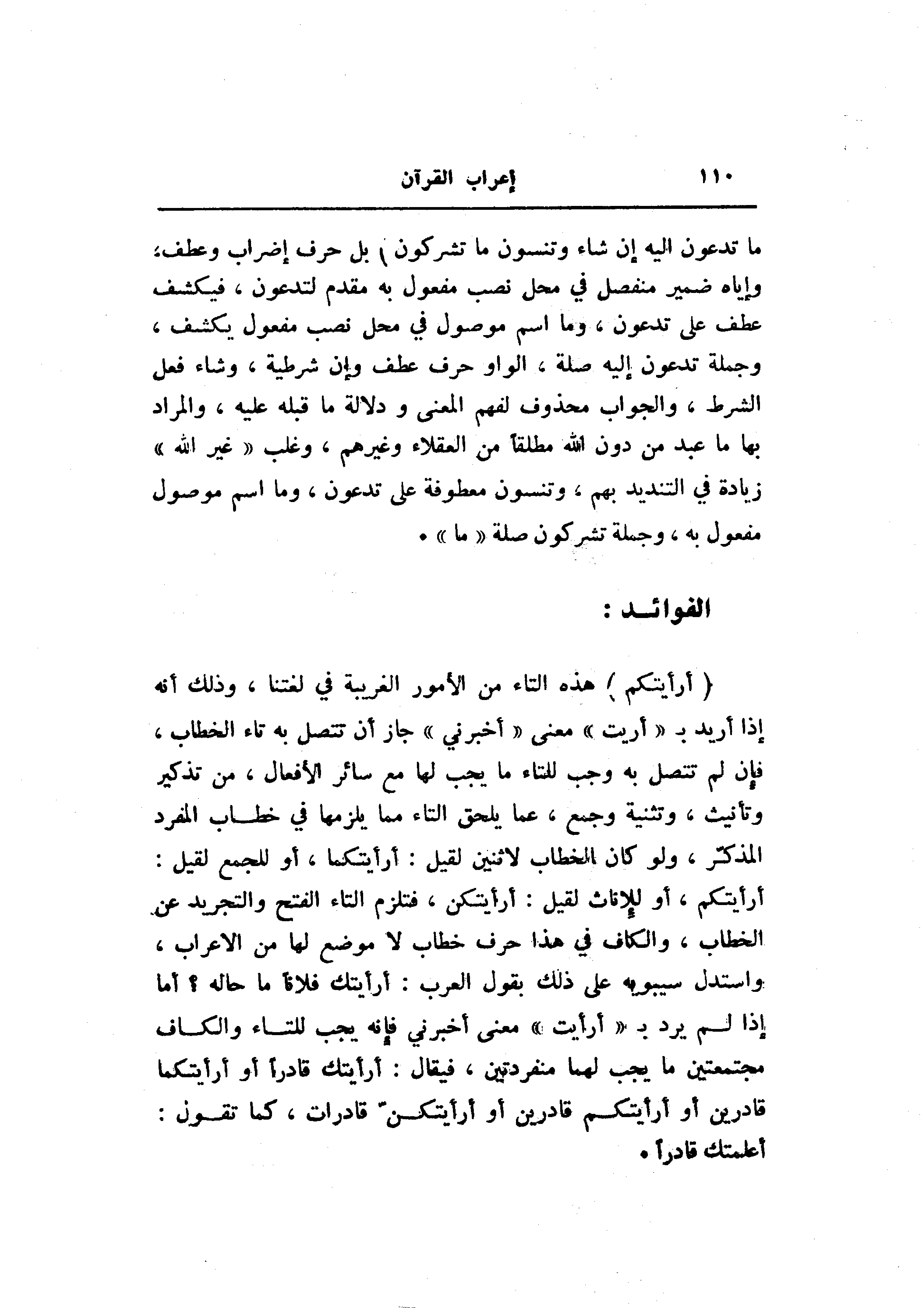 أرأيتكم، أو للإناث لقيل: أرأيتكن، فتلزم التاء الفتح والتجريد عن الخطاب، والكاف في هذا حرف خطاب لا موضع لها من الإعراب، واستدل سيبويه على ذلك بقول العرب: أرأيتك فلانا ما حاله؟ أما إذا لم يرد ب «أرأيت» معنى أخبرني فإنه يجب للتاء والكاف مجتمعتين ما يجب لهما منفردتين، فيقال: أرأيتك قادرا أو أرأيتكما قادرين أو أرأيتكم قادرين أو أرأيتكنّ قادرات، كما تقول: