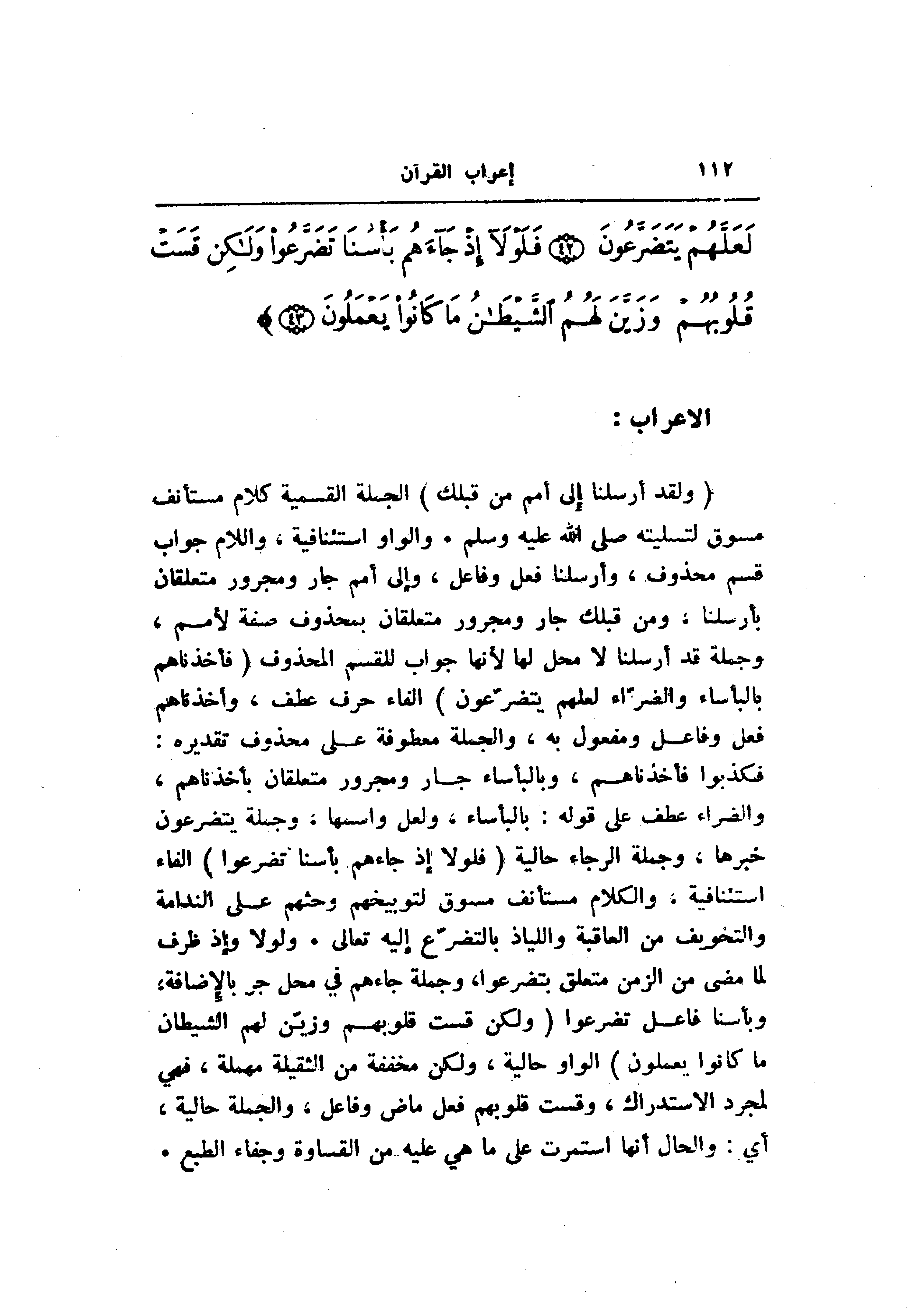 فكذبوا فأخذناهم، وبالبأساء جار ومجرور متعلقان بأخذناهم، والضراء عطف على قوله: بالبأساء، ولعل واسمها، وجملة يتضرعون خبرها، وجملة الرجاء حالية (فَلَوْلا إِذْ جاءَهُمْ بَأْسُنا تَضَرَّعُوا) الفاء استئنافية، والكلام مستأنف مسوق لتوبيخهم وحثهم على الندامة والتخويف من العاقبة واللياذ بالتضرّع إليه تعالى. ولولا وإذ ظرف لما مضى من الزمن متعلق بتضرعوا، وجملة جاءهم في محل جر بالإضافة، وبأسنا فاعل تضرعوا (وَلكِنْ قَسَتْ قُلُوبُهُمْ وَزَيَّنَ لَهُمُ الشَّيْطانُ ما كانُوا يَعْمَلُونَ) الواو حالية، ولكن مخففة من الثقيلة مهملة، فهي لمجرد الاستدراك، وقست قلوبهم فعل ماض وفاعل، والجملة حالية، أي: والحال أنها استمرت على ما هي عليه من القساوة وجفاء الطبع.